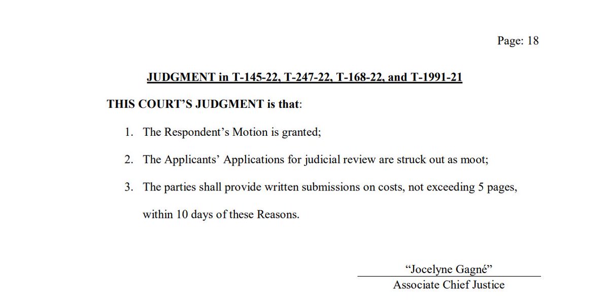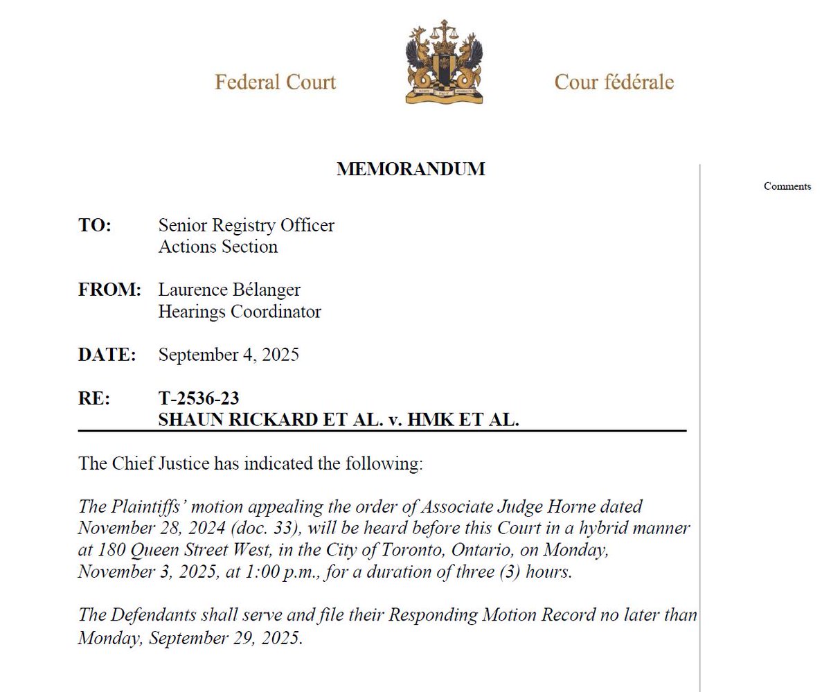 Very important update and letter addressed to the public from the Federal Court of Appeal (FCOA) in Ottawa. The letter attached addresses all of those who have already registered to watch our vaccine travel mandates mootness hearing live via Zoom on October 11th, 2023, and all those who still plan to do so - You will find a new web link provided by the FCOA to register below. The last update as to the total number of people who have registered thus far was 6,000, however this number was received over two weeks ago. After numerous attempts to get an updated total, I finally received an e-mail from a Clerk at the court late last week stating that they are no longer allowed to provide us with anymore updated totals. Our Lawyer is now looking into this for us. I can only assume that due to the success of the registration campaigns I've been running on various SM platforms, including here on X, that the total number of persons registered for the Zoom is currently well in excess of 10,000, however I cannot confirm this as of right now of course. It is imperative that ALL Canadians, who's lives & livelihoods were negatively impacted by the heinous & tyrannical vaccine travel mandates (and likely will be again this Fall/Winter) register to attend in-person or virtually. This will clearly demonstrate to the Canadian Judicial system, Judges, government officials and the media just how extensive the support and public interest is in this landmark case/lawsuit. Even if you're unsure whether or not you'll be busy that day, please register anyway, you are in no way obligated to attend if you can't make it. IMPORTANT REMINDER: Two of the primary rationales given by Justice Gagne for declaring our lawsuit moot last September are attached and can be seen below, but let me explain a little further. 1. [47] As a result, the Court is of the view that the judicial economy considerations outweigh the alleged important public interest and uncertainty in the law. = Justice Gagne felt that a public 5-day hearing would be a waste of court resources and that the financial costs would not be justified or warranted. 2. [49] There is no important public interest or inconsistency in the law that would justify allocating significant judicial resources to hear these moot Applications. = Justice Gagne felt that there would be no public interest in the case, and therefore it would be a waste of the court's time and resources. You can register here to attend live via Zoom, this is now a direct Zoom registration link set up by the court, it literally takes seconds to register: https://cas-satj.zoom.us/webinar/register/WN_VehMKVguTaaZ5YIlZPMN3A Full details on the hearing here: https://twitter.com/ShaunRickard67/status/1697249721109393719?s=20… and here: https://twitter.com/ShaunRickard67/status/1688907098850021376?s=20… Please repost and share this information here on X and on all of your other social media platforms. Thank you, Shaun & Karl