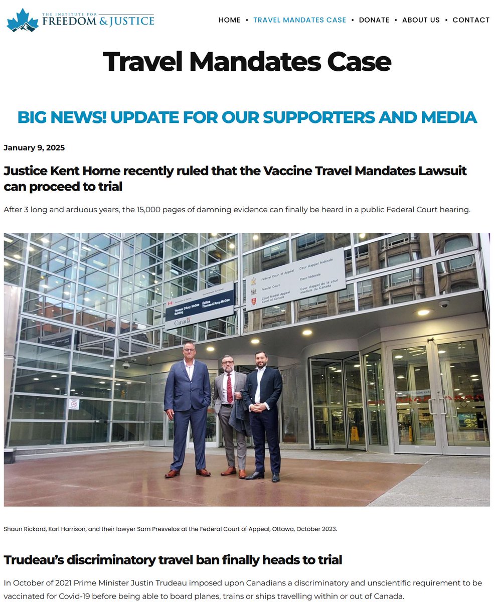 IMPORTANT UPDATE - Shaun Rickard and Karl Harrison's Vaccine Travel Mandates lawsuit - October 22nd, 2025 - @KarlDHarrison After nearly 4 years, the 15,000 pages of evidence – including some extremely damning/incriminating details – is getting closer to Court. Further to the Federal Court ruling that our landmark action can go to trial, the appeal to ensure the whole action can proceed will be heard on November 3rd, 2025 in the Federal Court of Appeal in Toronto. Further to our earlier and full update below from January 9th of this year, we now now move a step closer to the opportunity to fully hold the Liberal government, and Justin Trudeau, to account in court. Their divisive, cruel and unscientific overreach in imposing a nearly 9 months ban on unvaccinated Canadians and Permanent Residents from travelling on planes, trains and ships caused hardship and damage to millions of people in Canada. The hard work of our talented young lawyer, Sam Presvelos, paid off in June 2022 when evidence emerging in discovery in those earlier stages of the case caused then Attorney General David Lametti to reconsider the government’s position and the ‘vaccine mandate for travel’ was suspended with the implicit threat being made that they would do it again if they wanted to do so. In a moment of respite those millions of people, denied their fundamental Section 6 rights for nearly 9 months, could once again travel to see their loved ones and family events; to work; and to take much needed vacation time. This appeal, which will be heard at the Federal Court of Appeal in Toronto on November 3rd at 1pm Eastern Time, will consider whether Justice Kent Horne erred when he allowed the government’s motion to strike out two parts of our claim – those parts in relation to s.7 and s.12 of the Charter. Justice Horne allowed those parts in relation to s6 and s15 to go ahead to trial pending the outcome of this appeal and any further appeals that may follow. s.7 (life, liberty, security) deals with crucial rights that permit us all to decide for ourselves what happens to our body. We believe that the choice to accept a vaccine or not should be free of any sort of coercion or detrimental consequences imposed by any authority. They do not accept that the bar to their success in relation to s.7 is so high as to have no reasonable prospect of success and that their arguments should be allowed to proceed to trial. s.12 (cruel/unusual punishment) is normally heard in relation to the cruel and unusual punishment of people in the criminal justice system in relation to penal sanctions. We believe that then Prime Minister Trudeau developed the vaccine mandate as a deliberately cruel and unusual punishment for those Canadians who were exercising their s7 right to refuse the Covid-19 vaccines and, at the same time to use that punishment very publicly as a political campaign promise and ‘wedge issue’ in the 2021 General Election. The appeal will not be easy, but our case is in great hands with Sam Presvelos, the young litigator who achieved so much for millions of people in Canada who were, until June 2022, denied the right to even leave their country! If we succeed the government may then try to further appeal the decision to the Supreme Court of Canada. It is very apparent that they do not want this case to be heard and particularly, perhaps, the s.7 arguments. If we are unsuccessful at this stage, they may take their arguments to the Supreme Court. We want to have our arguments and evidence heard on all four Sections 6,7,12 and 15. More details, updates and options available to donate to our legal fund can be found here on our official website: https://www.freedomandjustice.ca/travel-mandates-case/