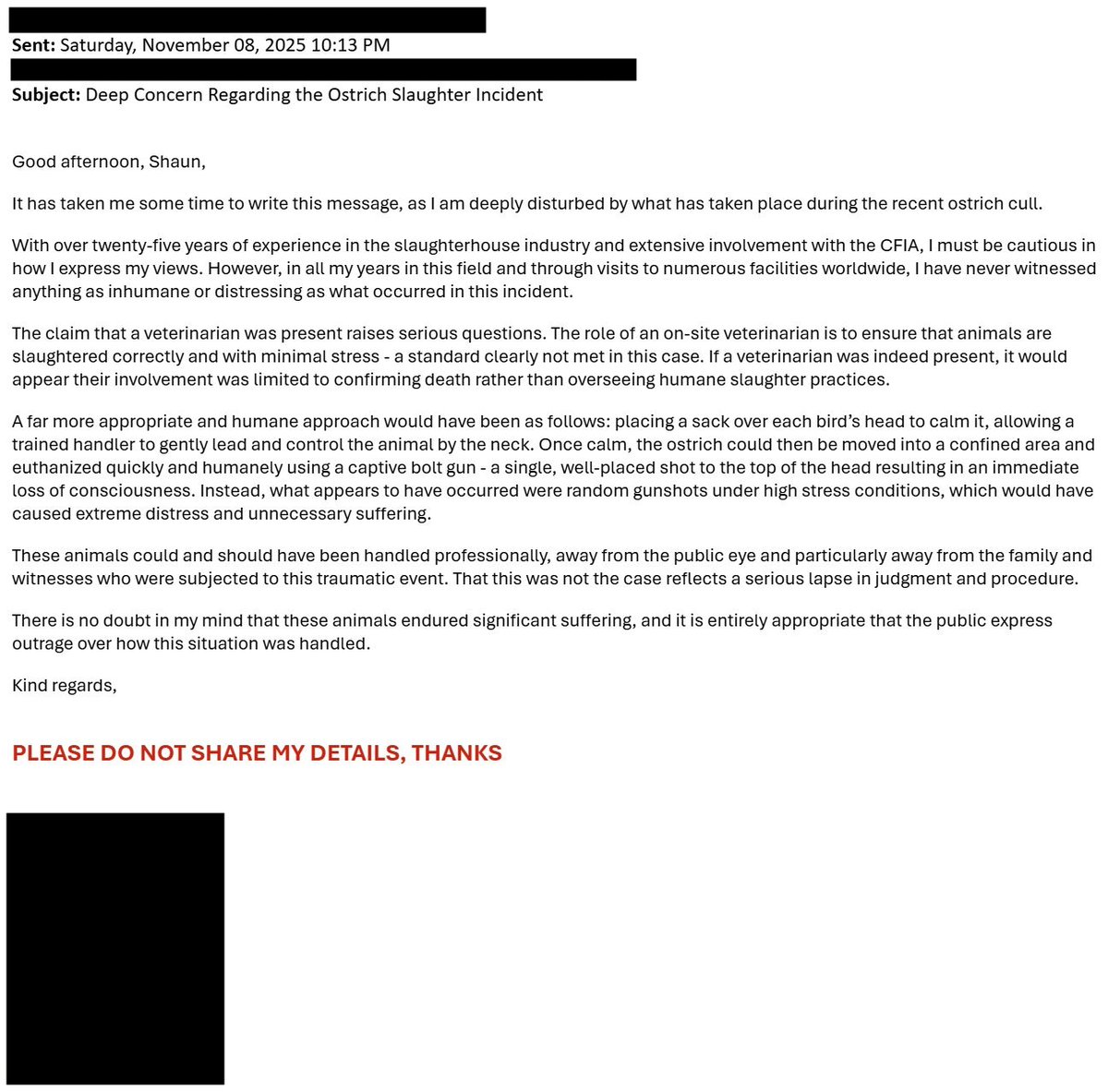 For those viewing this post on a phone, here is the text from the e-mail: "Good afternoon, Shaun, It has taken me some time to write this message, as I am deeply disturbed by what has taken place during the recent ostrich cull. With over twenty-five years of experience in the slaughterhouse industry and extensive involvement with the CFIA, I must be cautious in how I express my views. However, in all my years in this field and through visits to numerous facilities worldwide, I have never witnessed anything as inhumane or distressing as what occurred in this incident. The claim that a veterinarian was present raises serious questions. The role of an on-site veterinarian is to ensure that animals are slaughtered correctly and with minimal stress - a standard clearly not met in this case. If a veterinarian was indeed present, it would appear their involvement was limited to confirming death rather than overseeing humane slaughter practices. A far more appropriate and humane approach would have been as follows: placing a sack over each bird’s head to calm it, allowing a trained handler to gently lead and control the animal by the neck. Once calm, the ostrich could then be moved into a confined area and euthanized quickly and humanely using a captive bolt gun - a single, well-placed shot to the top of the head resulting in an immediate loss of consciousness. Instead, what appears to have occurred were random gunshots under high stress conditions, which would have caused extreme distress and unnecessary suffering. These animals could and should have been handled professionally, away from the public eye and particularly away from the family and witnesses who were subjected to this traumatic event. That this was not the case reflects a serious lapse in judgment and procedure. There is no doubt in my mind that these animals endured significant suffering, and it is entirely appropriate that the public express outrage over how this situation was handled. Kind regards,"