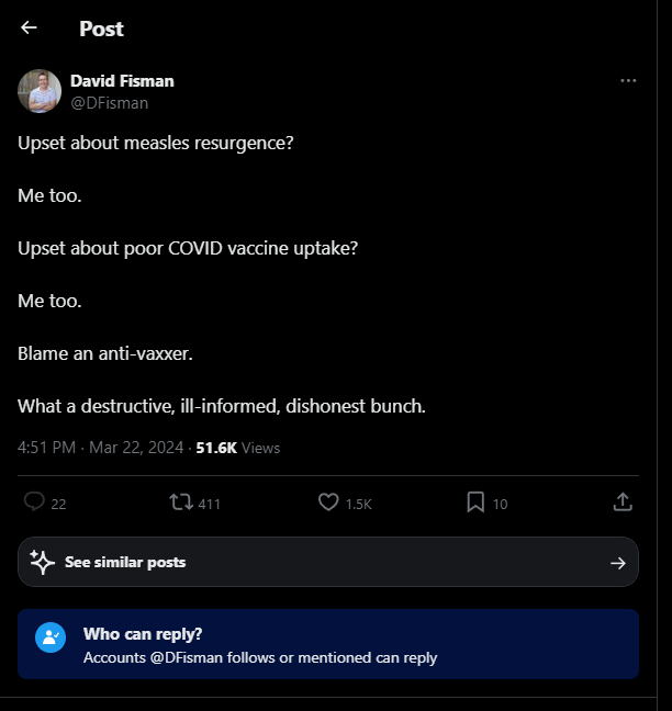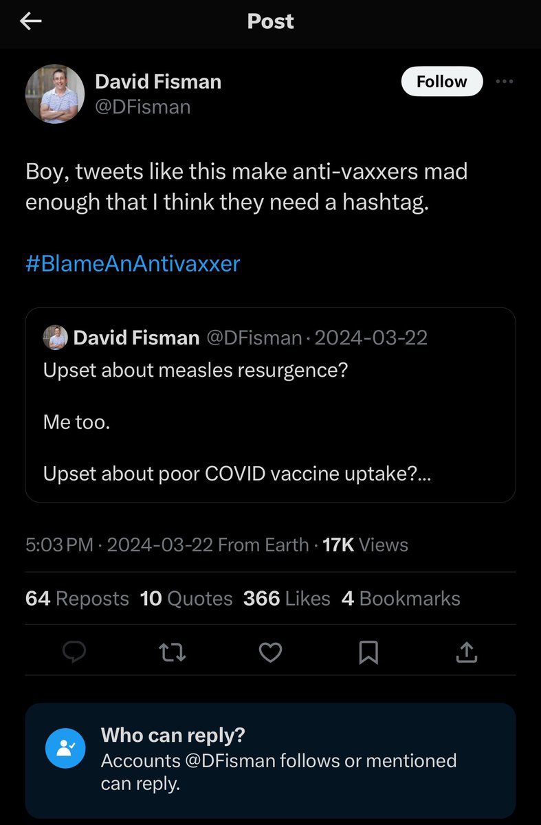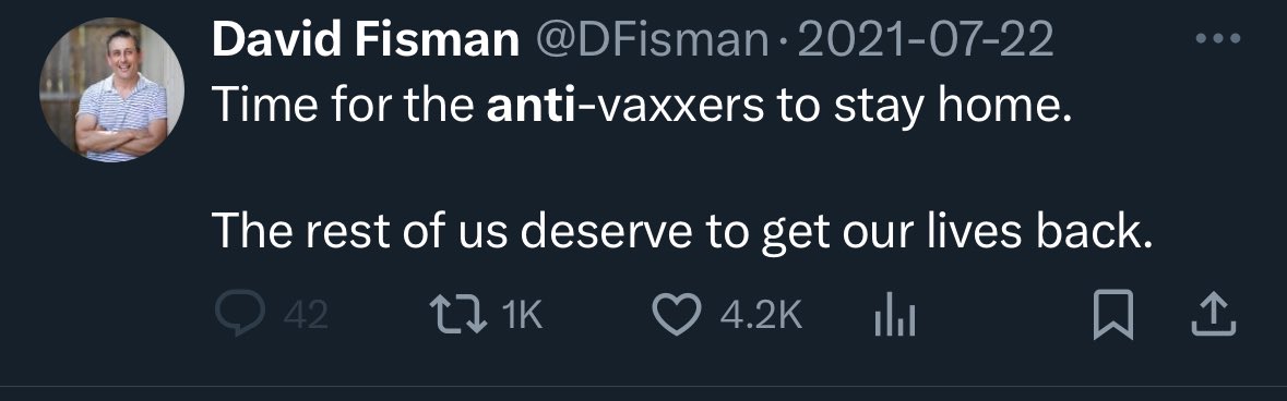 VERY IMPORTANT ANNOUNCEMENT - It appears that Dr. David Fisman is deleting controversial/incriminating content/posts from his X/Twitter feed. Here's how you can help - If you have screenshots of any incriminating/controversial content/posts that #DavidFisman has made over the past 4 years, please post them here as a comment and we will catalogue them to present as evidence. One particular post we are interested in which he recently deleted reads like this: "Upset about poor COVID vaccine uptake? Me too. Blame an anti-vaxxer." *Please repost this and share it widely on all of your other SM accounts - Thank you. @ReginaWatteel @KarlDHarrison @stkirsch @NChartierET @rupasubramanya @jordanbpeterson @TuckerCarlson @rustyrockets @ConradMBlack @TheRedactedInc @natalimorris @WoodReporting @thevivafrei @elonmusk @RandPaul @RWMaloneMD @joerogan @Jim_Jordan @SenRonJohnson @P_McCulloughMD