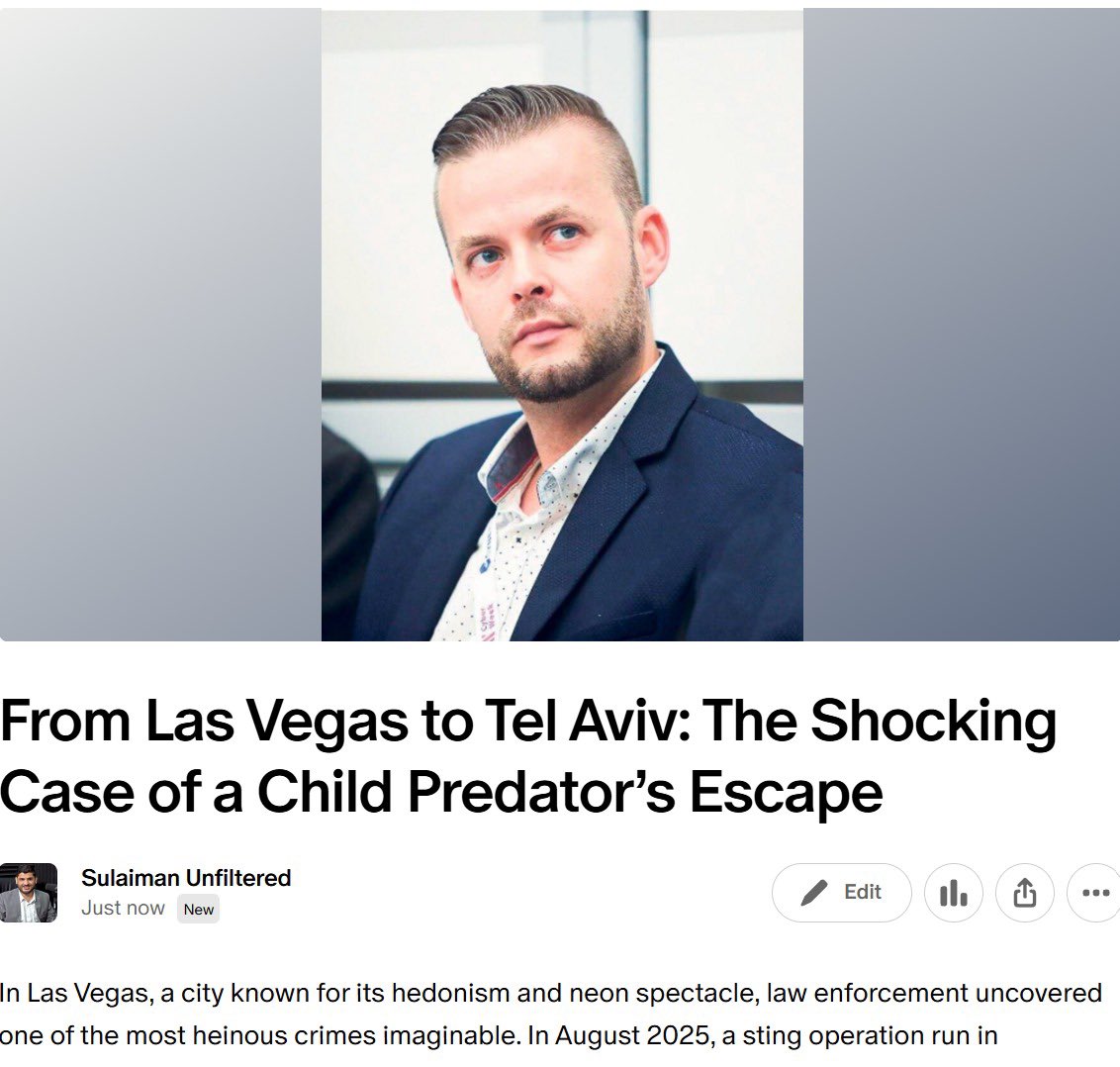 🚨FROM LAS VEGAS TO TEL AVIV: THE SHOCKING CASE OF A CHILD PREDATOR’S ESCAPE LINK: https://www.patreon.com/posts/from-las-vegas-136793684?utm_medium=clipboard_copy&utm_source=copyLink&utm_campaign=postshare_creator&utm_content=join_link Link: https://open.substack.com/pub/sulaimanahmed/p/from-las-vegas-to-tel-aviv-the-shocking?r=22v07v&utm_campaign=post&utm_medium=web&showWelcomeOnShare=false