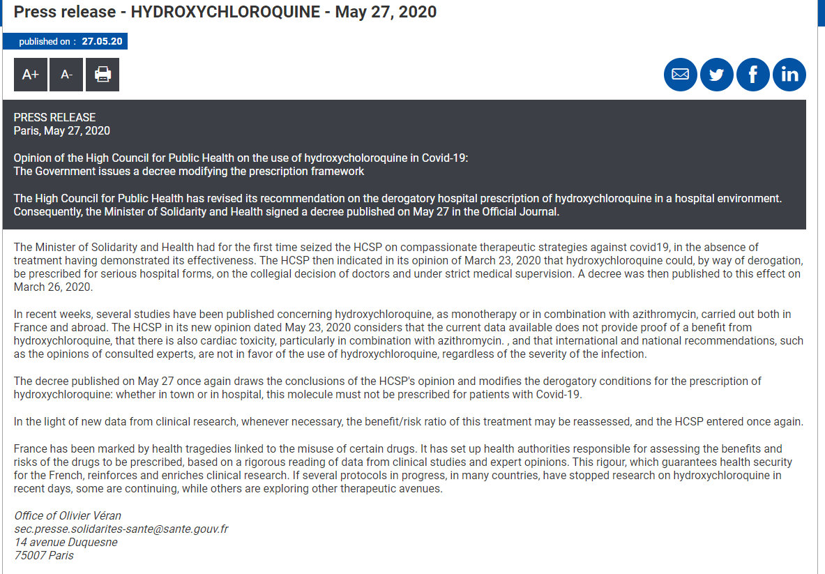 4. Within days, multiple public health agencies including WHO and the UK equivalent of the FDA, the MHRA, ordered clinical trials of hydroxychloroquine for COVID-19 suspended while the French reversed an earlier decree allowing the drug to be prescribed to hospitalized patients.