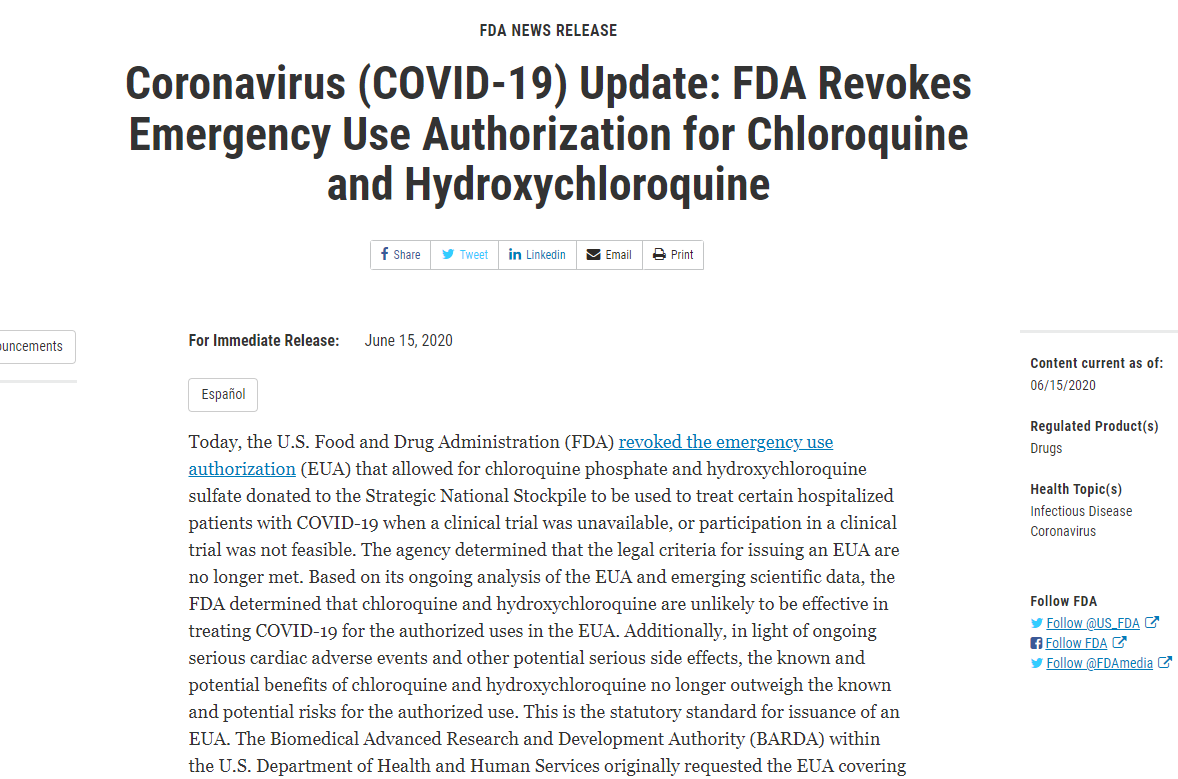 5. The FDA, not wanting to be viewed as laggards in comparison to their European counterparts, followed suit and revoked emergency use authorization for hydroxychloroquine.