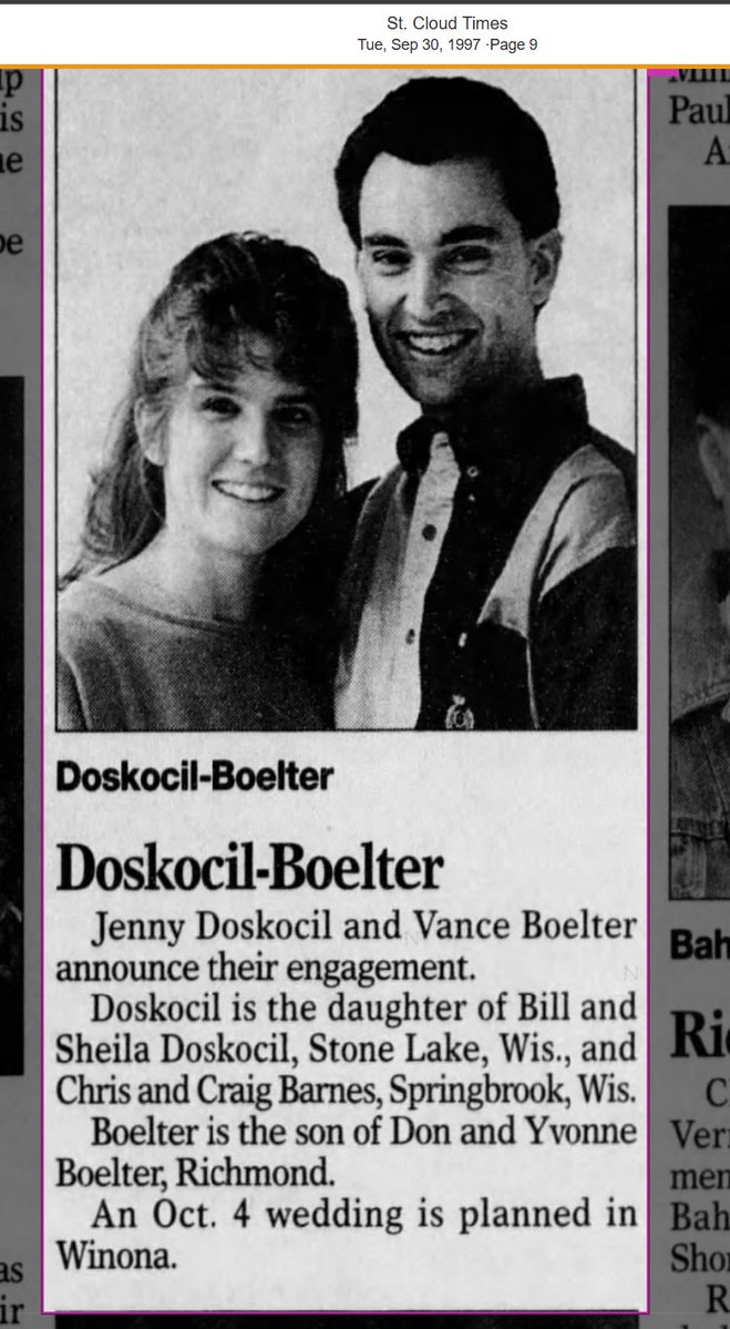 And then there's Jennifer Lynne Doskocil, born March 22, 1974. They married on October 4, 1997 in Winona County. Cert #: 1221691997000173