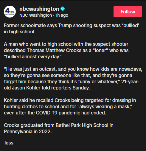 According to NBC Washington, Thomas Matthew Crooks was frequently bullied for things like wearing a mask when in high school. This is former classmate Jason Kohler. Everything about his demeanor and speech patterns are bizarre and off to me, what do you think? https://t.co/mpIZ9UvD98