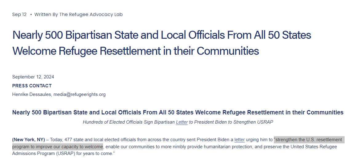 Three days ago, a group of nearly 500 elected officials co-signed a letter addressed to the Biden-Harris administration urging them to “strengthen the U.S. resettlement program" claiming 2.4 million refugees need a new home. There is at least one signatory for every state.