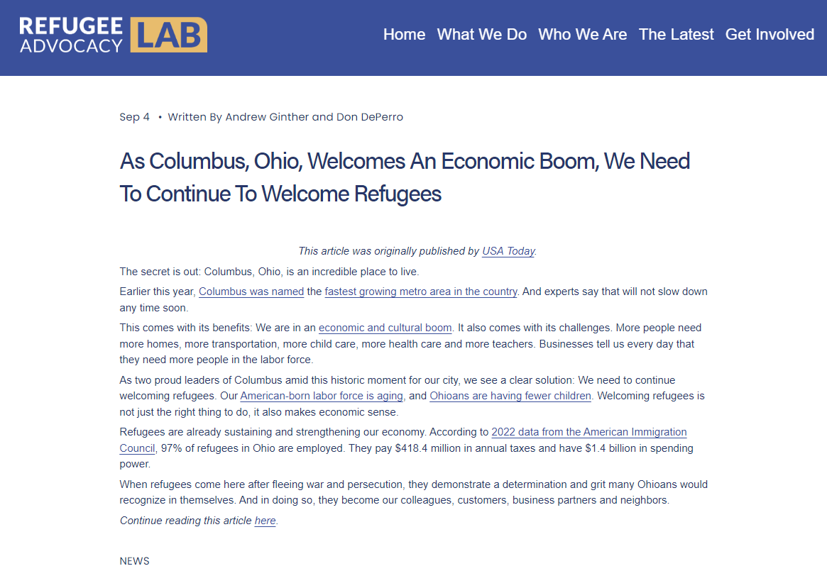 Allow me to introduce you to the Refugee Advocacy Lab. https://www.refugeeadvocacylab.org/resources/columbus-ohio-continue-to-welcome-refugees