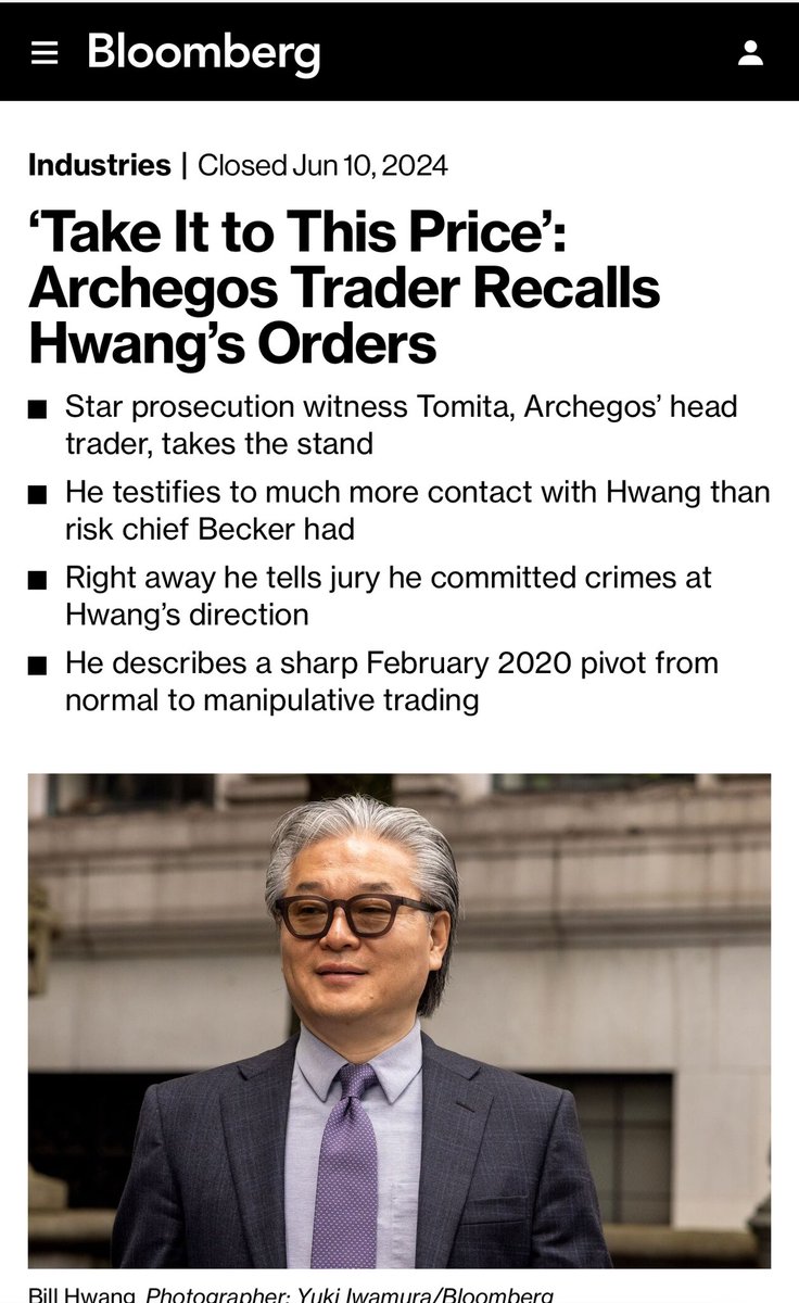 Not a good day in court for Archegos Founder Bill Hwang "Former Archegos head trader William Tomita took the stand for what’s expected to be several days of testimony as one of the prosecution’s star witnesses. He immediately admitted committing “financial crimes, namely market manipulation and lying to banks,” then implicated Hwang. “I was directed to do so by my former boss,” Tomita said, identifying Hwang in court. Of the major witnesses, Tomita worked most directly with Hwang himself and is therefore key to connecting the Archegos founder to the charged conduct. Tomita said Hwang instructed his traders to do “the opposite” of what a “normal fund” would. He noted that normal funds would try to build up their positions at the lowest cost and try to minimize the impact of their own trading on prices. At Archegos, Tomita said he says he could see the effect of the volume of the firm’s trades versus others and knew he was moving the market. "I could see that it was me that generated the stock price,” he testified..." https://www.bloomberg.com/news/live-blog/2024-06-10/archegos-trial-june-10