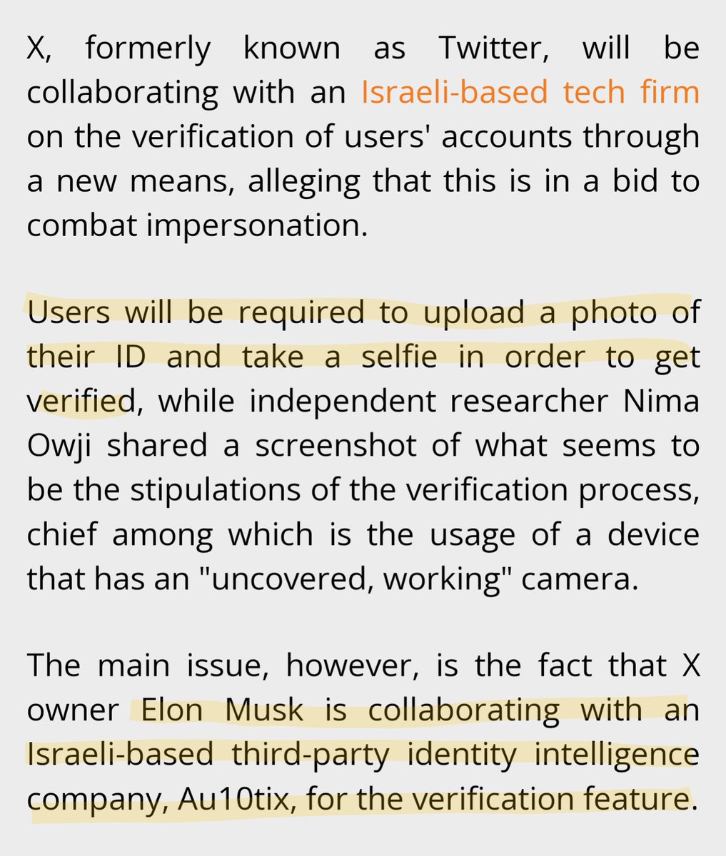 I was tempted to subscribe to X but then I saw this and went Hell No. "X will be cooperating with an Israeli-based tech firm to verify the identity of users who wish to verify their accounts under a new system." https://english.almayadeen.net/news/technology/x-will-send-your-id-face-to-israeli-based-firm-to-verify-you