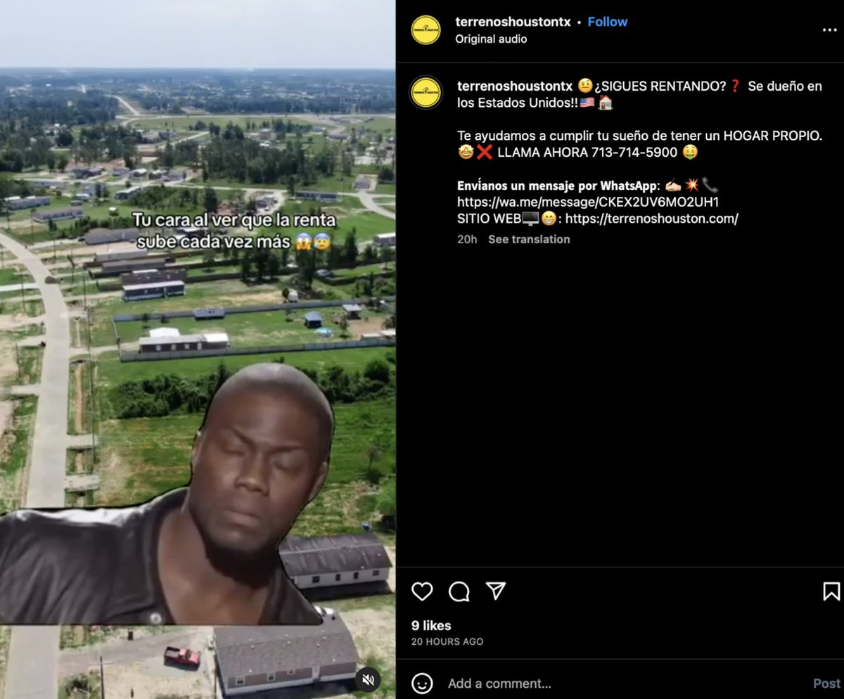 CR goes by "Terrenos Houston" on Instagram, where marketing materials are entirely in Spanish. Here's a post where they tell buyers to "own land in the 'Estados Unidos'" and reach out on WhatsApp, an app tailored for international comms. And it gets worse.