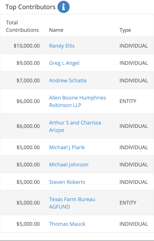 Meet State Rep. Ernest Bailes, who represents the district where Colony Ridge is located. He took $1,800 from Harris, and his case is interesting. His biggest donor is Randy Ellis — he owns the earthwork and clearing company employed by Colony Ridge.