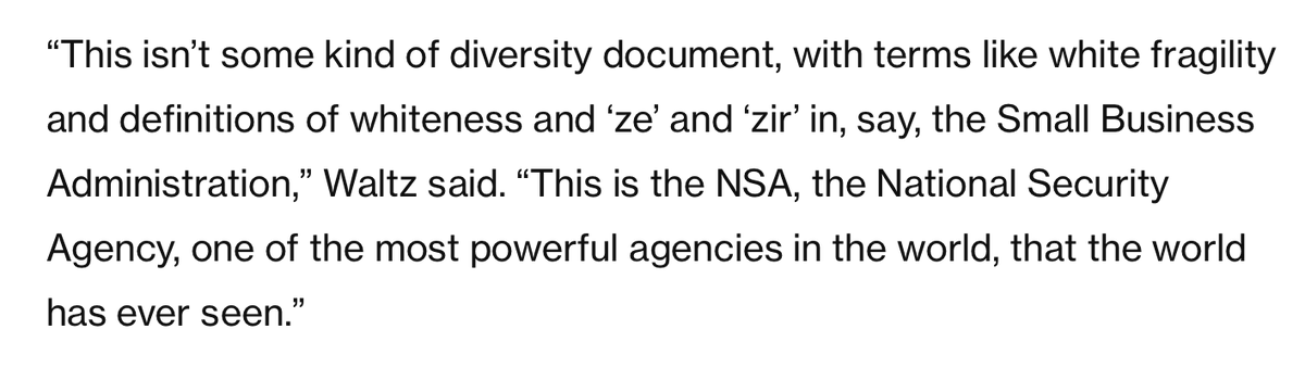 “This isn’t some kind of diversity document, with terms like white fragility and definitions of whiteness and ‘ze’ and ‘zir’ in, say, the Small Business Administration,” Waltz told me. This ideological capture is happening at "one of the most powerful agencies in the world."