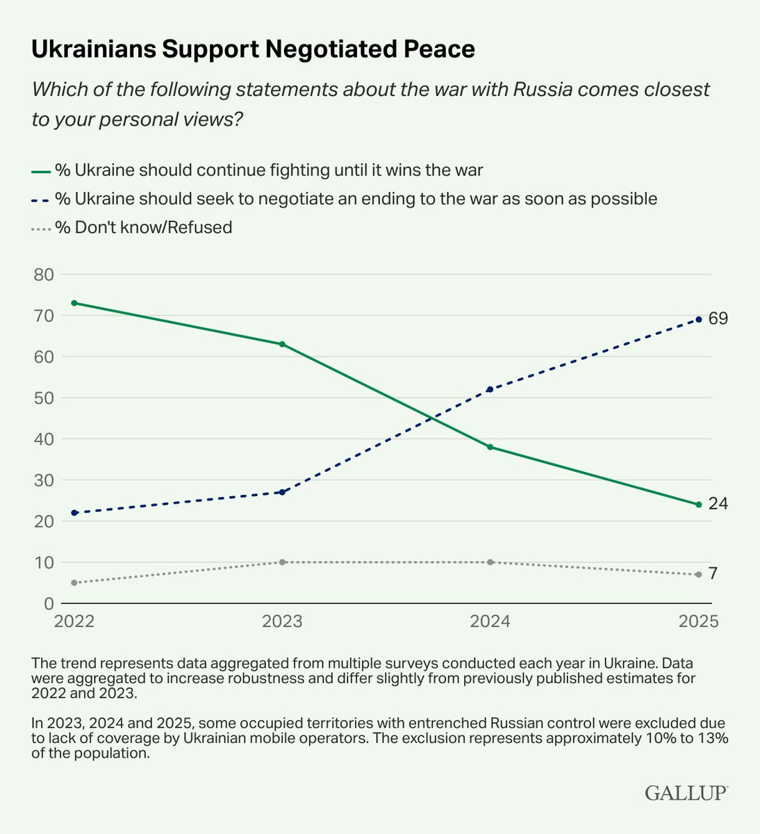 8️⃣ FOR UKRAINE, FIGHTING ON MAKES NO SENSE A recent Gallup poll shows 69% of Ukrainians favor a peace deal over fighting to the last man. That makes Zelensky and Europe’s position “irrational,” Raffone says. “How can they think to ‘save’ Ukraine without Ukrainians?” https://t.co/KkaxL2FRpu