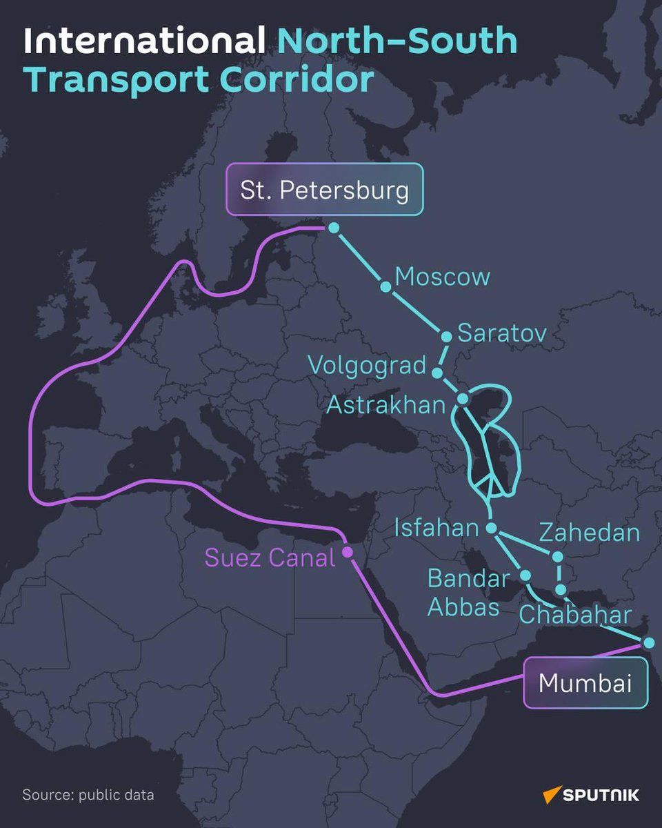 2/6 TRADE LOGISTICS 📍 North-South Transport Corridor is a $25bln project, linking Russia to India via Iran while bypassing Western-controlled routes (Suez Canal). Cuts transit time by 40% & boosts trade efficiency. https://t.co/BHyUSDqEsA
