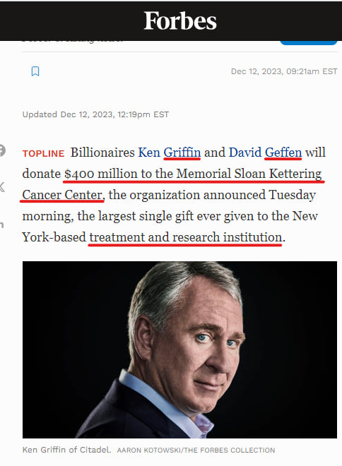 20. https://www.forbes.com/sites/maryroeloffs/2023/12/12/billionaires-griffin-and-geffen-donating-400-million-to-memorial-sloan-kettering-cancer-center-largest-in-hospitals-history/?sh=201d68737246 Griffin..Geffen 🤔