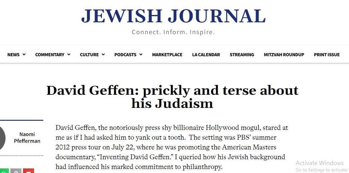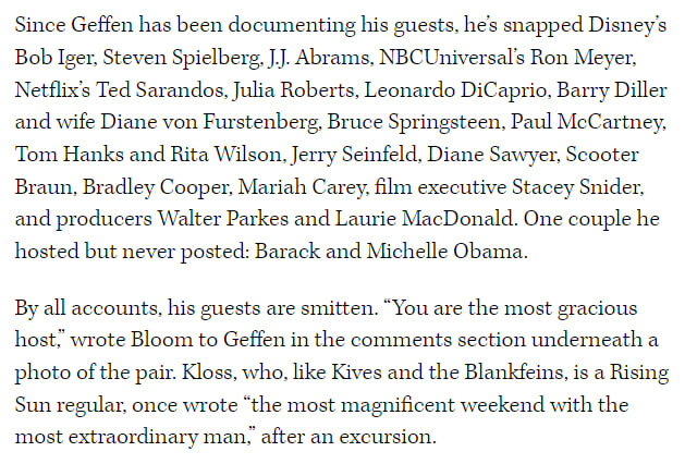 58. 'So, David Geffen, a slim little kid who escaped Brooklyn to fulfill his dream in Hollywood, becomes a maestro of the rock generation after starting as an agent. "What does an agent do?" he asked, at first...' https://www.huffpost.com/entry/inventing-david-geffen_b_2088100