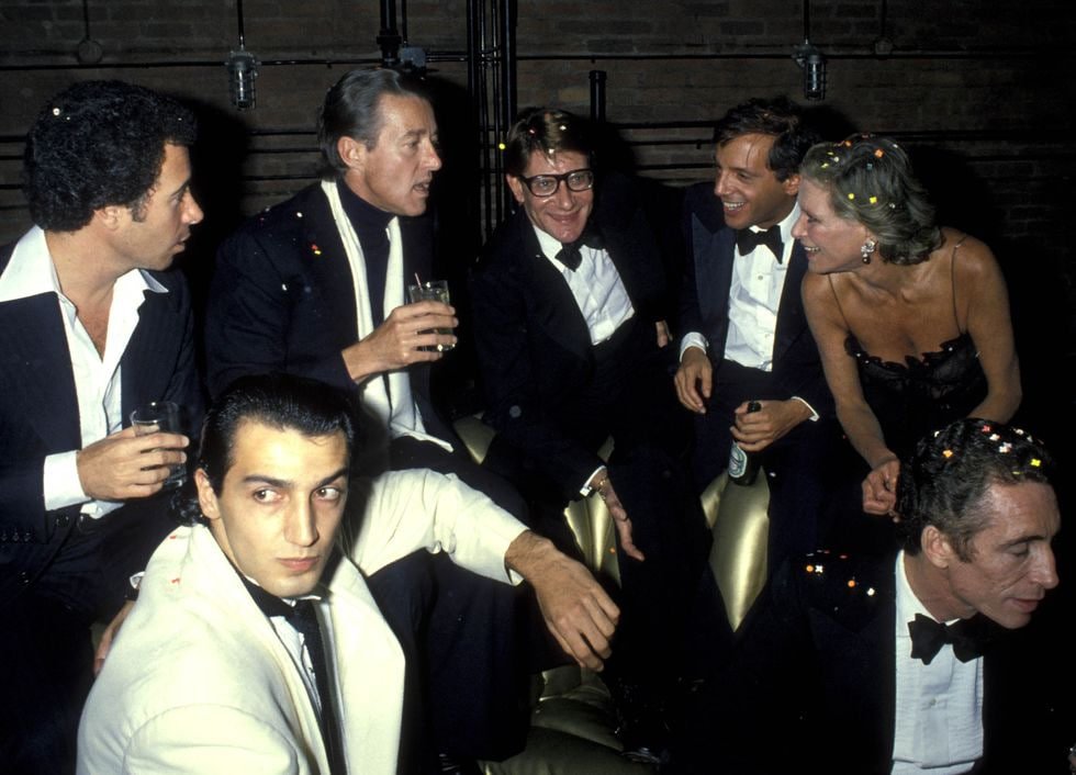 32. David Geffen, Halston, Yves Saint Laurent, Steve Rubell, Nan Kempner, and Fernando Sanchez attend the Opium perfume launch after-party at Studio 54 in 1978.