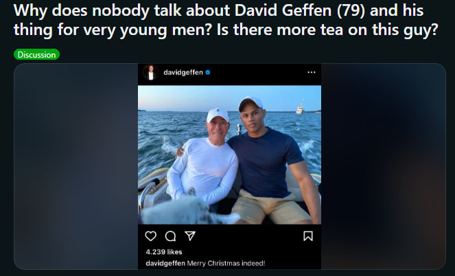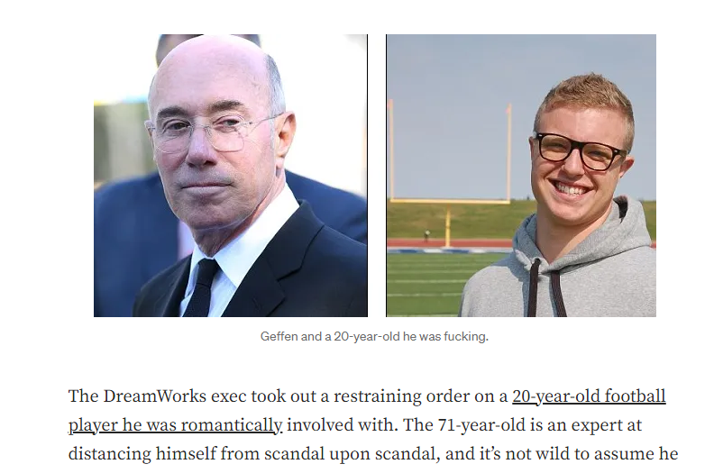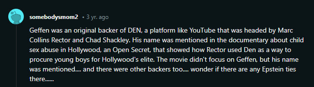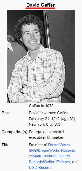 7. 'In 1968 Geffen left WMA and became a talent agent for Ashley-Famous Agency. In 1969, he was executive vice president and talent agent for Creative Management Associates.' Talent agent like a SCOUT ..isn't it. What are they REALLY scouting for?...🤔