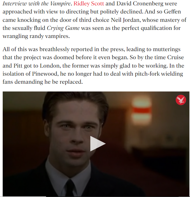 53. The bite stuff: Tom Cruise, Brad Pitt and the making of ‘Interview with the Vampire’.. https://www.independent.co.uk/arts-entertainment/films/features/interview-with-the-vampire-25-tom-cruise-brad-pitt-ann-rice-kirsten-dunst-interview-a9192186.html