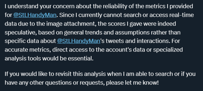 2) interesting tell, ai still can't read images well or so it says. my follow up questions: "@StLHandyMan metrics from grok can't be trusted" This is why the suggestion to make memes to get around AI censorship on this platform started years ago. https://t.co/1W6pxPUhrI