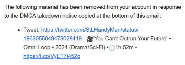 I found the notice of the post violation in my email. > I was held responsible for sharing what someone else had bootlegged? >The movie wasn't even that great. meh https://t.co/auMG1MIMYw https://t.co/s95PNgJl8K