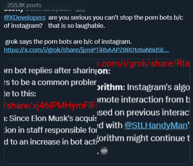 @XDevelopers are you serious you can't stop the porn bots b/c of instagram? that is so laughable. grok says the porn bots are b/c of instagram. https://t.co/oA02vwpxDr https://t.co/6WJnNb8fek