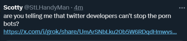 @XDevelopers screenshot the grok reply's about porn bots b/c they will come up missing. like this one. https://t.co/vQjnV7qn8n