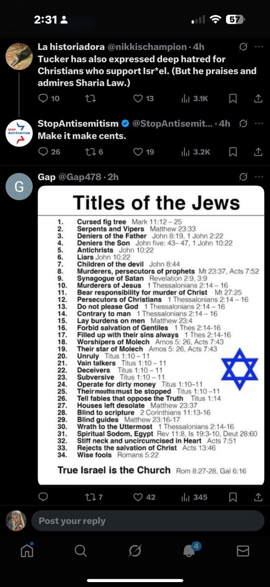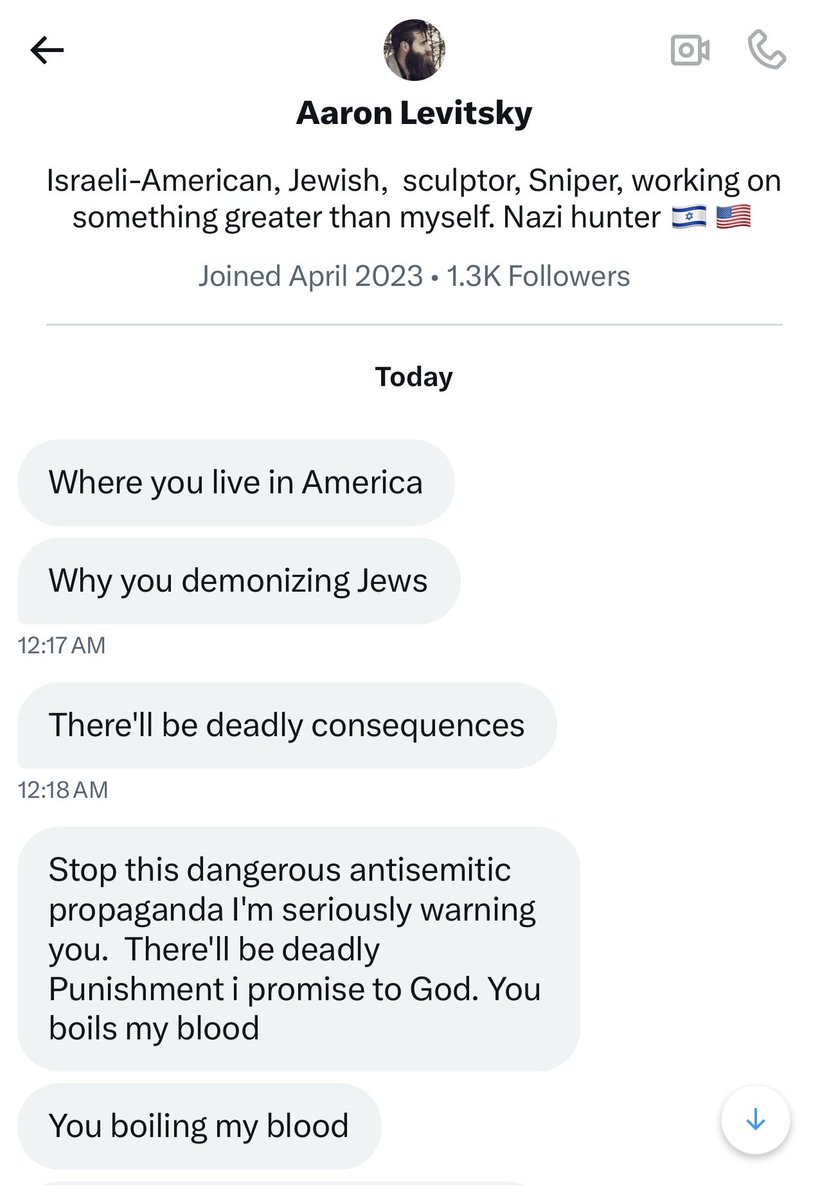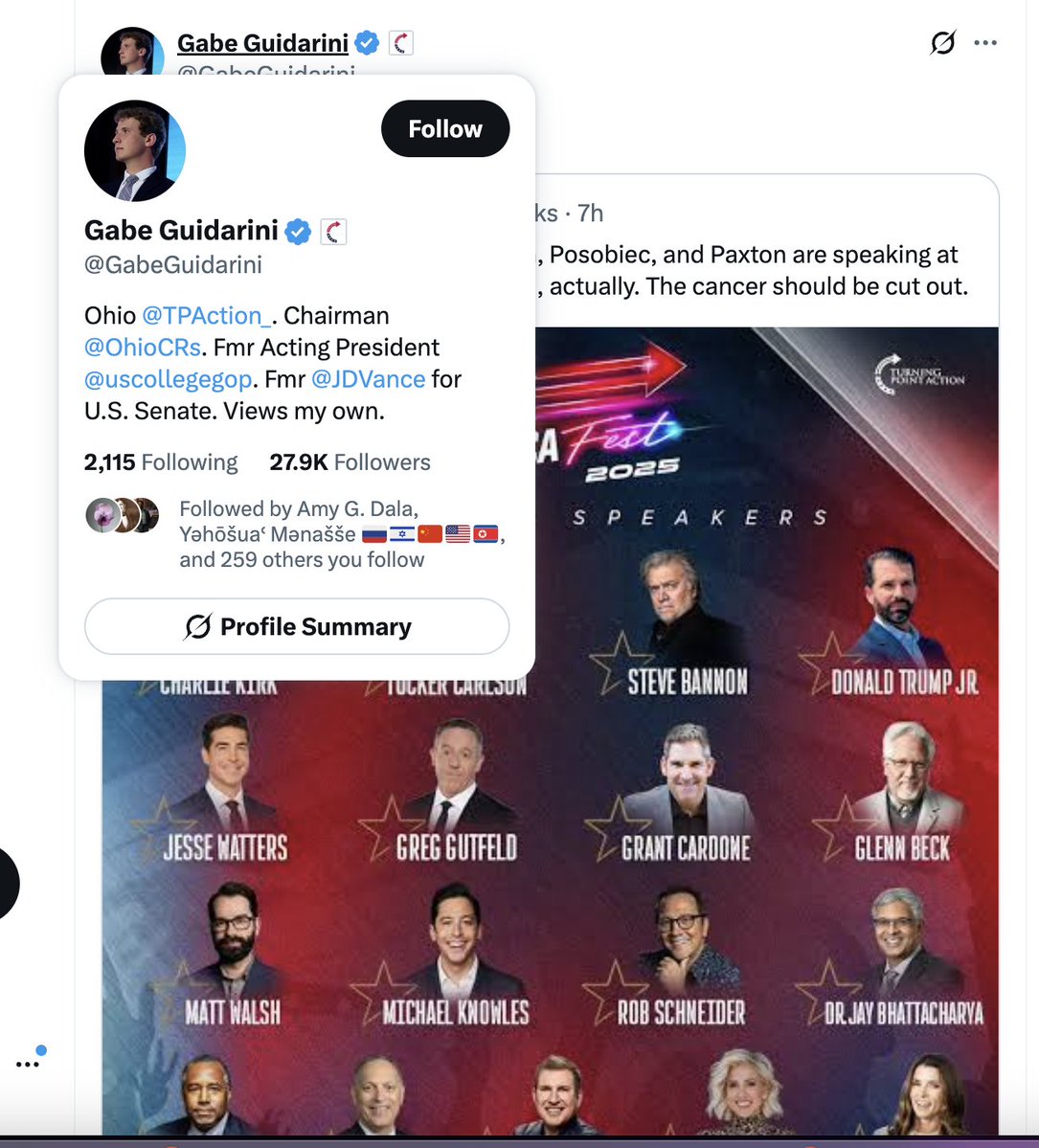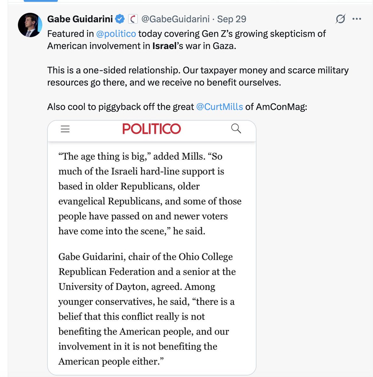 Now @TPUSA's Ohio Director calls me an "Israeli" because I'm Jewish - like I'm a foreigner in my own damn country!! Gabe says Jews don't belong in America and that our loyalty to this country is suspect. Gabe deliberately equates Judaism with treason, which is a classic European mistake. Gabe says when Republican American Jews complain about foreign policy or antisemitism, it makes young Republicans hate us. Gabe with @TPUSA says American Jews should shut up, or else. Is this TPUSA's position?? @AndrewKolvet please call your dog off. For 24 hours, @GabeGuidarini has been out here harassing Jews for objecting to Tucker. #TPUSA