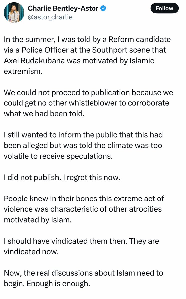 But then Telegraph and Critic journalist Charlie Bentley-Astor dropped the real bombshell… She revealed that police on the scene had informed a Reform party candidate that Rudakubana’s actions were motivated by Islamic extremism.