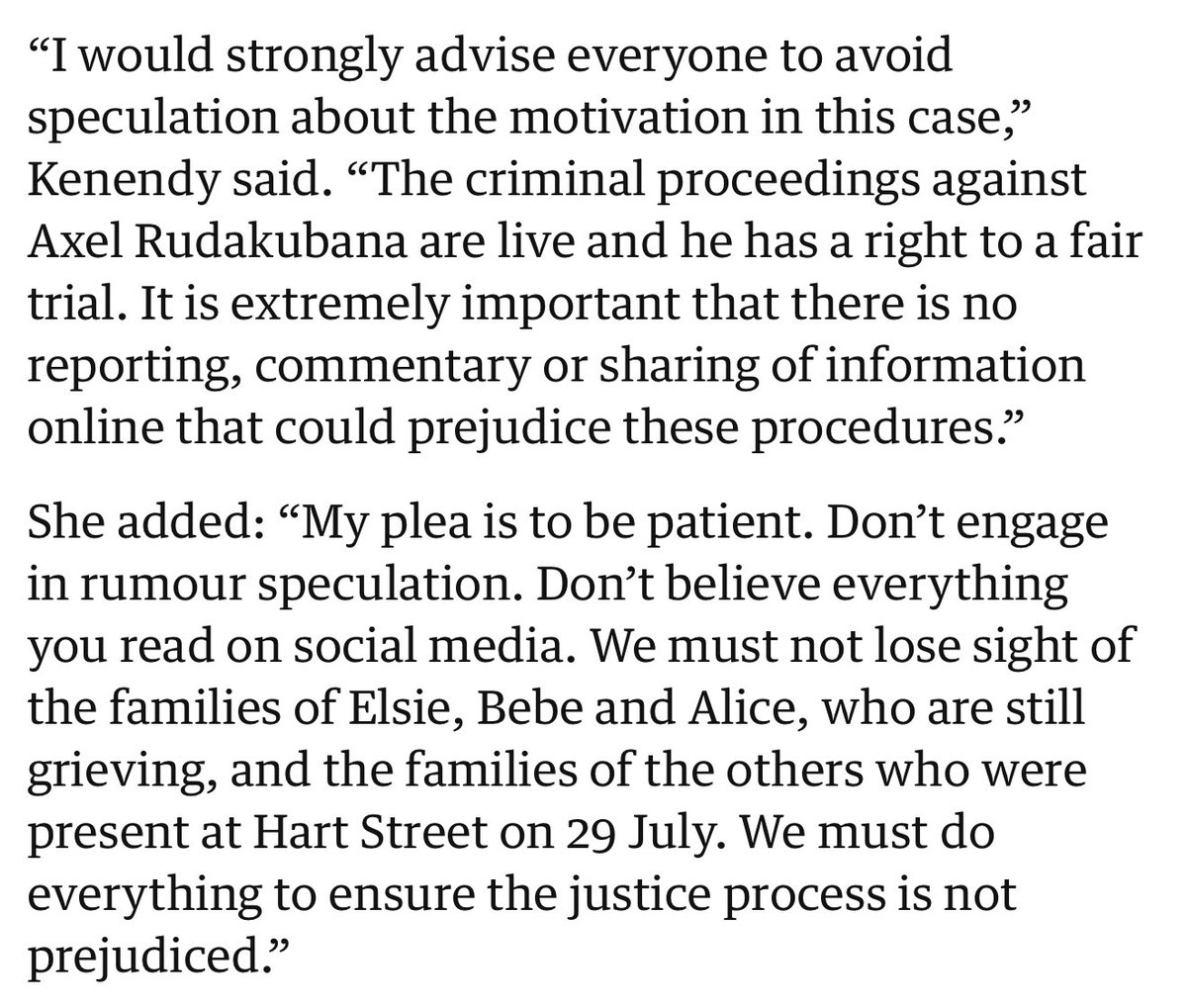Kennedy emphasised that the criminal proceedings are ongoing and warned that any commentary could compromise Rudakubana’s right to a fair trial.