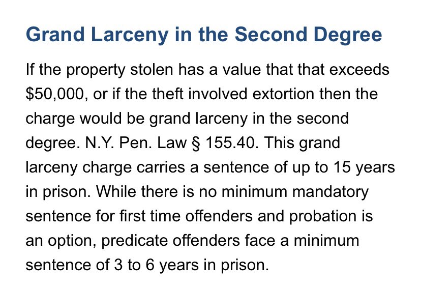 Dear Alvin Bragg, Michael Cohen stole over $50,000.00 from the Trump Organization, which is a felony. You have the wrong person on trial. Grand Larceny in the Second Degree: PL 155.40(1) is a felony whereby the pilfering exceeds $50,000 but is not more than $1 million in value. https://t.co/3UpDedZLbG