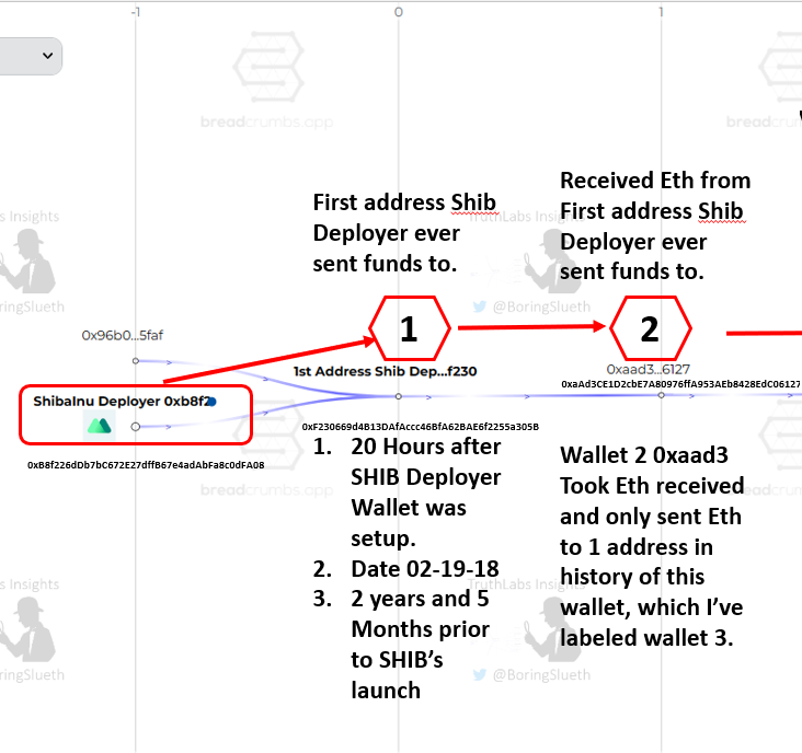 Here is a look showing the trail where ShibaInu Deployer sent 0xf230 Eth and then 0xf230 turned around and sent 0xaad3 that same Eth. Remember, this all stems from the 1st ever outbound trx form the ShibaInu Deployer, 2 years and 5 months prior to SHIB every being launched! 4/8