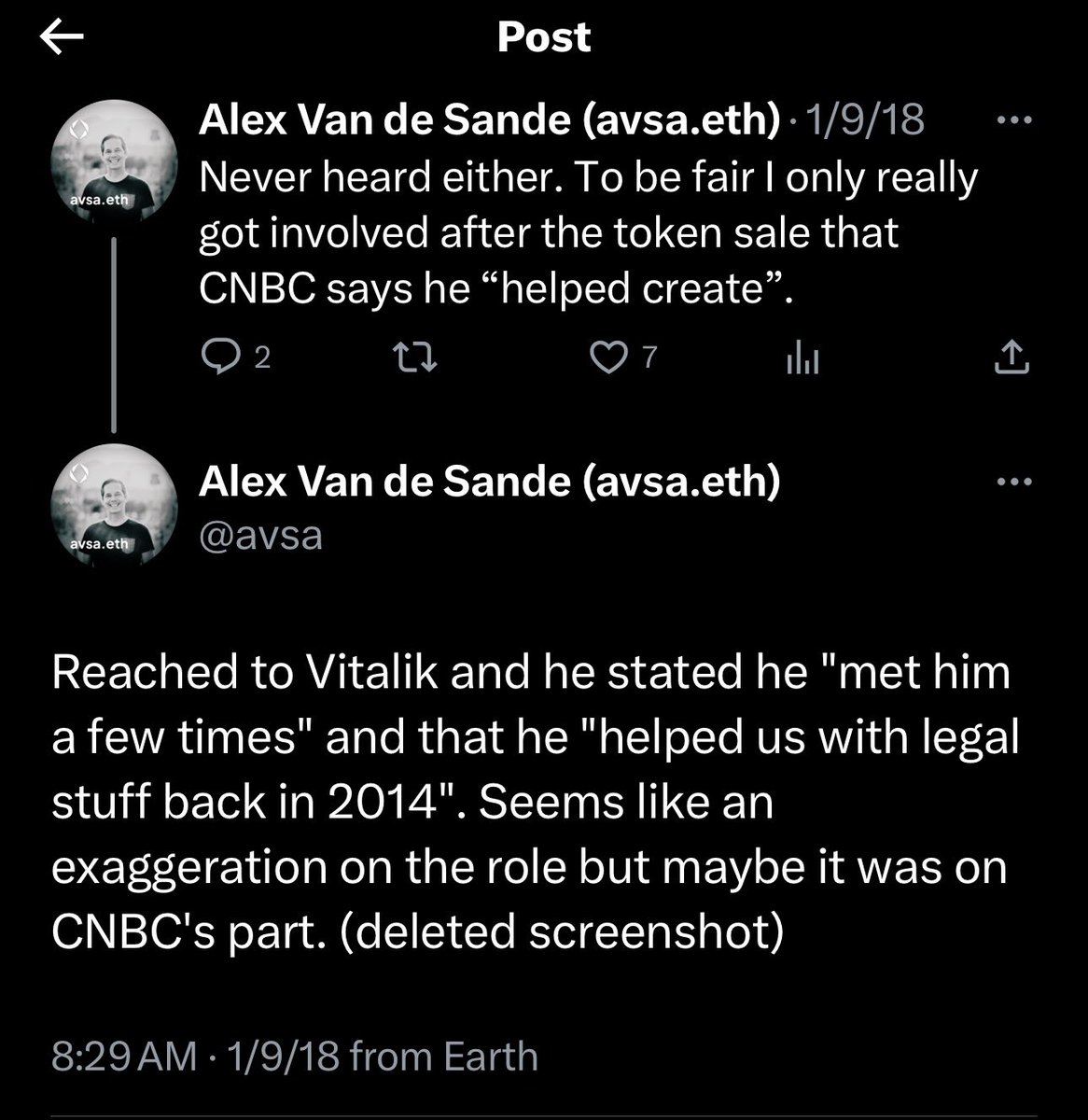 @leashless @iamtexture @CNBC @stevennerayoff Reached to Vitalik and he stated he "met him a few times" and that he "helped us with legal stuff back in 2014". Seems like an exaggeration on the role but maybe it was on CNBC's part. (deleted screenshot)