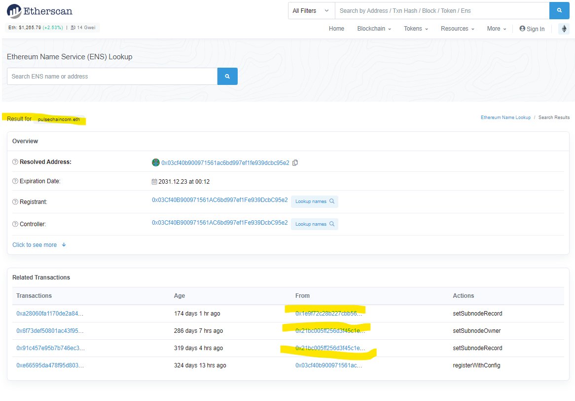 Below, you can see that 0x1e9f is also the owner of 0x63616.eth. Do you want to know who also registered and owns pulsechaincom.eth? 3/6