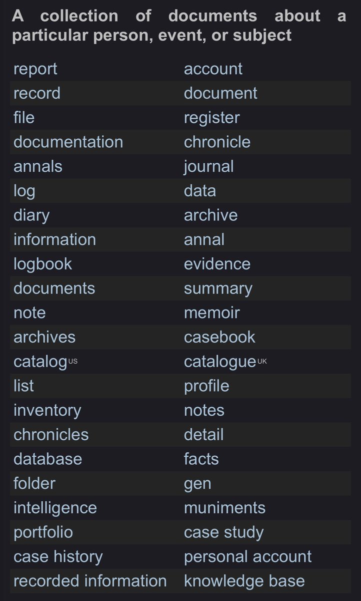 I like dossier it sounds uncovering which, guess what, it is! But here’s a list of synonyms & I’ll take community direction. Shoot away! https://t.co/lOfx2NuK0d
