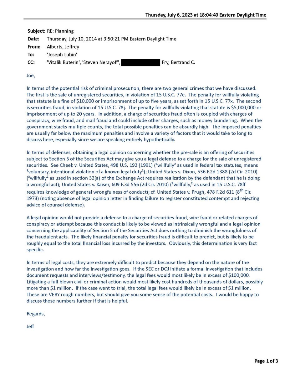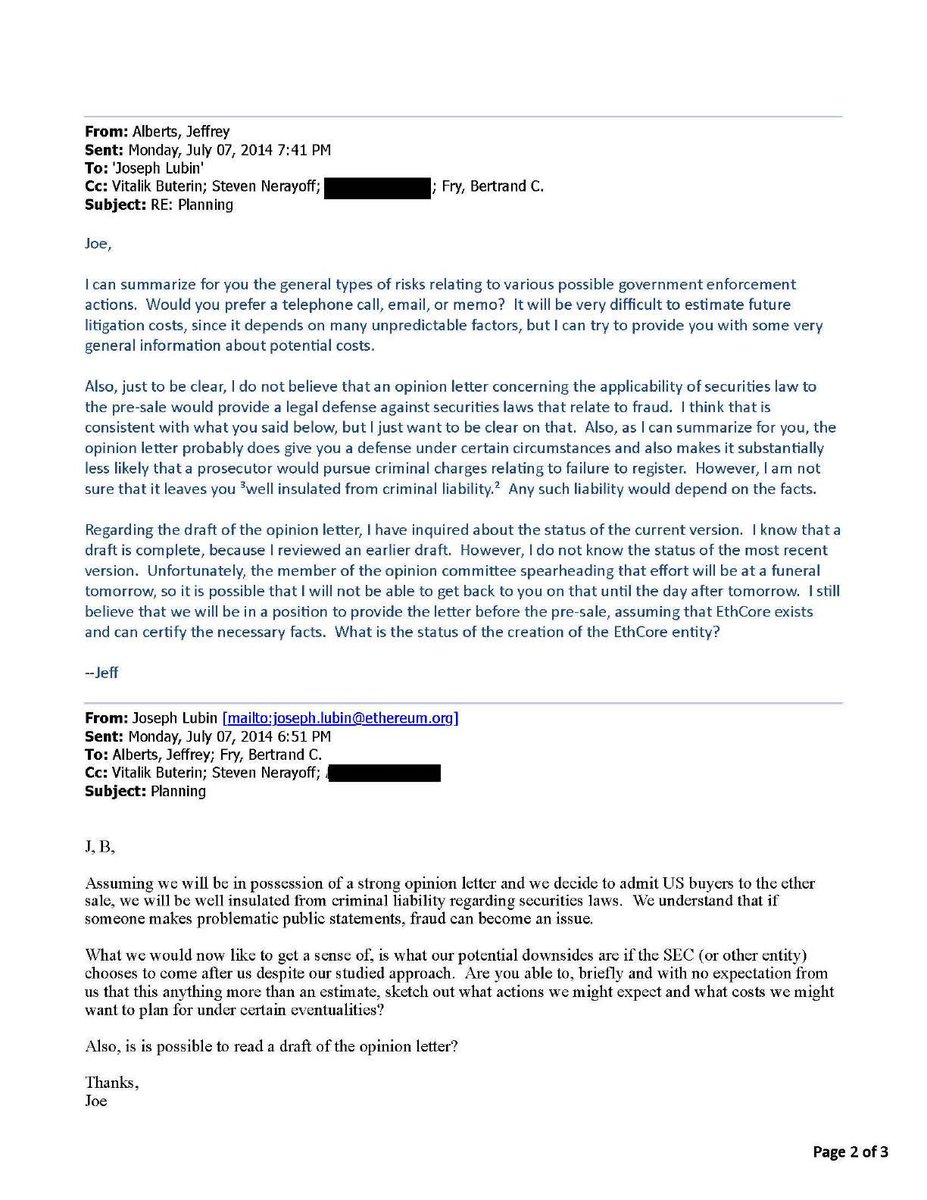 “Lubin & Vitalik Concerned About Criminal Liability before ICO” Asked the lawyers about “criminal liability” right before Ethereum ICO. Now I see why given subsequent corruption & trying to imprison me to cover this all up. Why were they so concerned about criminal liability? “We understand that if someone makes problematic public statements, fraud can become an issue.” Joe Lubin