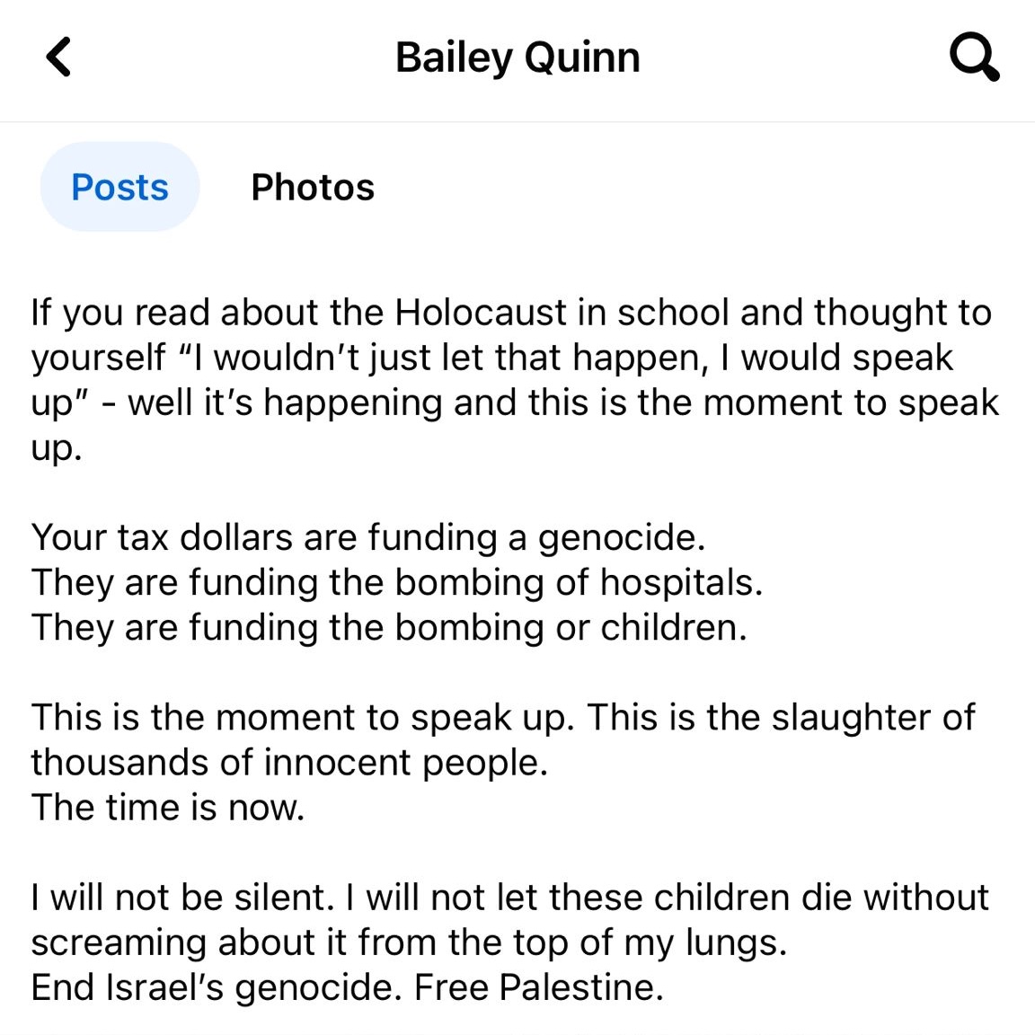 Bailey Quinn is a pediatric resident at UConn Health in Connecticut. Quinn took to social media to deny babies in Israel were beheaded by Hamas terrorists and instead, expressed her outrage that Gaza was without power. Quinn also doesn't appear to be concerned for the American children kidnapped by Hamas. She does however, have one goal - maligning the world's only Jewish state with false claims of genocide. Can Jewish babies and children ever be trusted in her care?