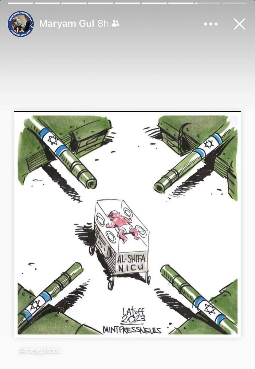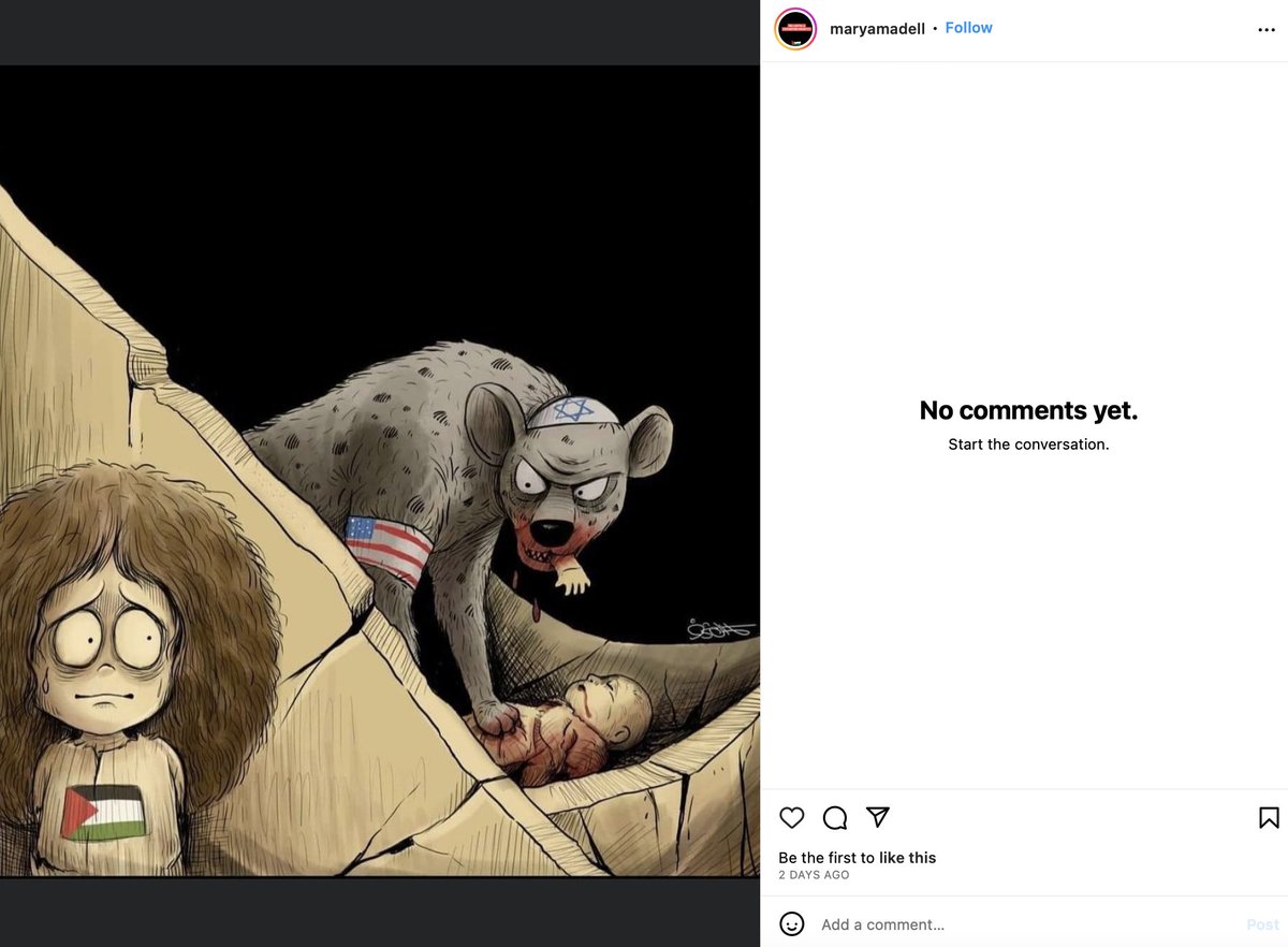 NYC - we are horrified to see Physician's Assistant Mariam Abdelghany with @NYCHealthSystem share a graphic on Instagram portraying a Jew depicted as an animal eating a baby, with what appears to be a Palestinian child watching from the side. Abdelghany's NYC Health System profile -https://archive.ph/nhvZQ - Abdelghany's LinkedIn archive - https://archive.ph/ye7xi