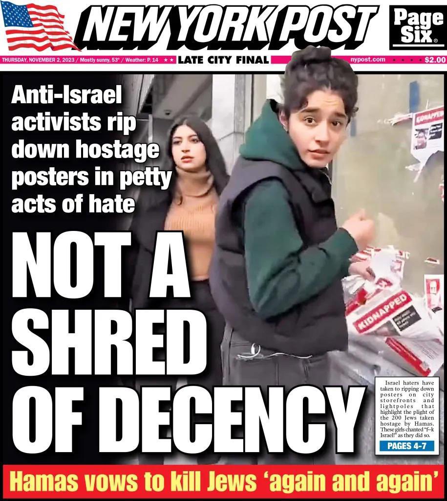 UPDATE: The two woman ripping down posters of kidnapped Israelis taken into Gaza by Hamas at NYU yesterday have been identified as Hafiza Khalique (left) and Yazmeen Deyhimi (right). Yazmeen Deyhimi has deleted both of her IG and Twitter accounts; her LinkedIn is still live and lists a 2019 internship with the ADL (!) https://archive.ph/w7LN6 (Haifa) https://archive.ph/jAV8b (Yazmeen) @nyuniversity @NYPDTips @NYPDHateCrimes @NYCMayor