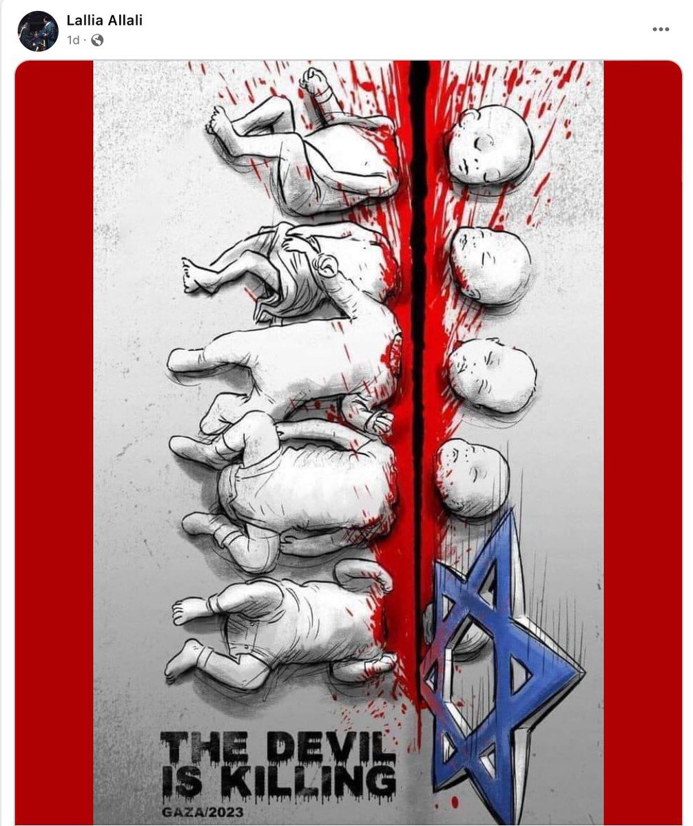 We are horrified to see Lallia Allali, wife of Imam Taha Hassane of the Islamic Center of San Diego, post this horrific image to her Facebook profile. The graphic shows a Jewish star murdering babies with “the devil is killing” at the bottom. Allali is also the local leader of the Palestinian Youth Movement, an entity tied to the anti Israel protests occurring all over the U.S. these past few weeks.