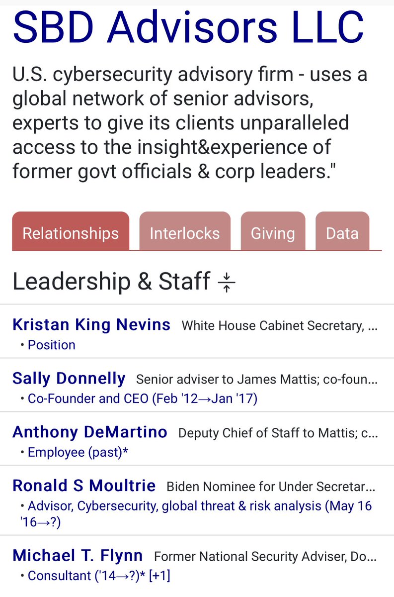 Did I just find a Soros/Flynn connection? @genflynn has been a consultant at SBD Advisors LLC since 2014, “U.S. cybersecurity advisory firm - uses a global network of senior advisors, experts to give its clients unparalleled access to the insight&experience of former govt officials & corp leaders."” SBD’s parent company is ITC Secure. “Formed in 1995 ITC Secure operates from offices in London and Washington D.C. ABOUT ITC SECURE Formed in 1995, ITC Secure operates from offices in London and Washington D.C. Our mission is to be trusted experts, providing customers with cyber solutions and the confidence to operate in an otherwise uncertain digital world. Cyber security is our core focus, our services are divided into two business units, ITC Cyber Advisors and ITC Managed Security Services. We deliver next generation cyber security services, supported by expert analysts and world class advisors from our dedicated Security Operations Centre to businesses worldwide. Our approach to cyber security is to help our customers to understand their own cyber maturity and deliver clear assessments of their current capabilities. This advisory driven approach allows customers to develop clear cyber strategies and get the most out of their security investments. In addition to our cyber advisory and managed security services, we have an international group of senior security specialists, each of whom has held high office in government, military and intelligence services.” The company provides services to ultra left wing like @business (Bloomberg), @Uber and @GM. Aren’t these companies also connected to George Soros? https://littlesis.org/org/412878-SBD_Advisors_LLC https://littlesis.org/org/389182-ITC_Secure