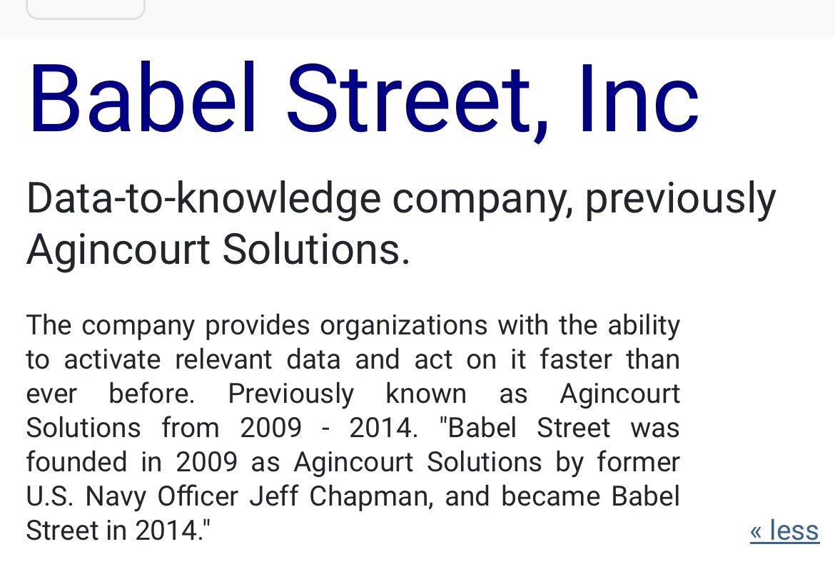 Who is Babel Street, Inc? Babel Street, Inc is Data-to-knowledge company, previously Agincourt Solutions. “The company provides organizations with the ability to activate relevant data and act on it faster than ever before. Previously known as Agincourt Solutions from 2009 - 2014. "Babel Street was founded in 2009 as Agincourt Solutions by former U.S. Navy Officer Jeff Chapman, and became Babel Street in 2014."” Babel Street is a client of the US Department of Justice and US Army and provides services to the United States Special Forces Command and FBI. They are also partners with the National Military Intelligence Foundation. Babel Street, Inc is the parent company of “Locate X”, a location tracking product. Location tracking? Hmmm 🤔 There’s definitely a lot of red flags here. Seeing what we’ve put forth let’s ask some questions and expand.
