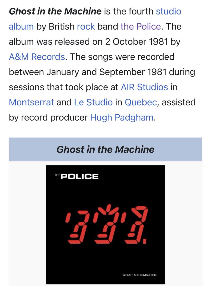 Thread 🧵 Ghost in the Machine, the band The Police, and @GenFlynn??? @inthematrixxx and @shadygrooove covered the psyop division of the @USArmy and the “ghost in the machine”. In 1981, The Police released the album “Ghost in the Machine”. How is this connected to what Jeff and Shady have been covering? https://en.m.wikipedia.org/wiki/Ghost_in_the_Machine_(album)…
