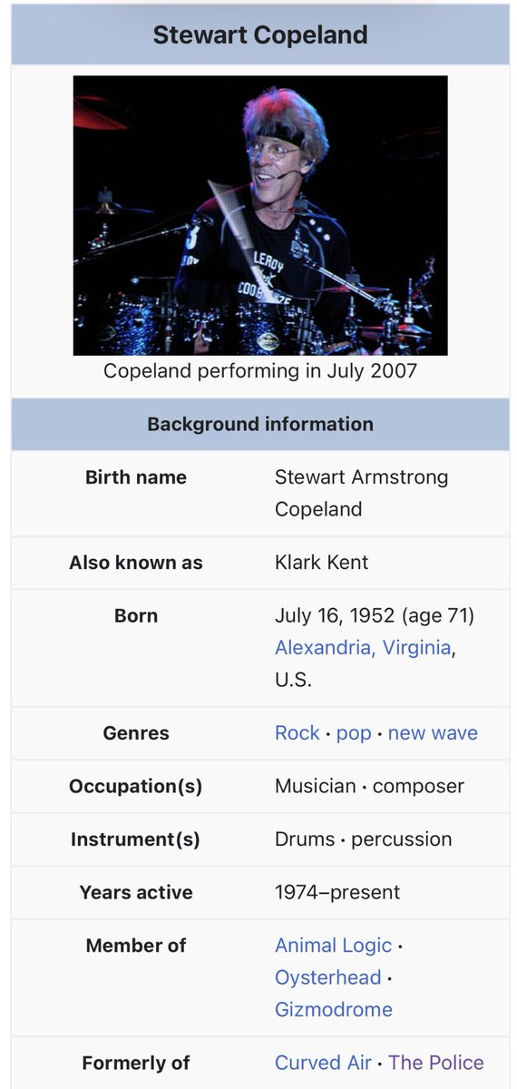 Copeland was born in July of 1952 in Alexandria, Virginia as the youngest child of Scottish archaeologist Lorraine Copeland and FOUNDING MEMBER OF THE OSS AND CIA MILES COPELAND JR. https://en.m.wikipedia.org/wiki/Stewart_Copeland