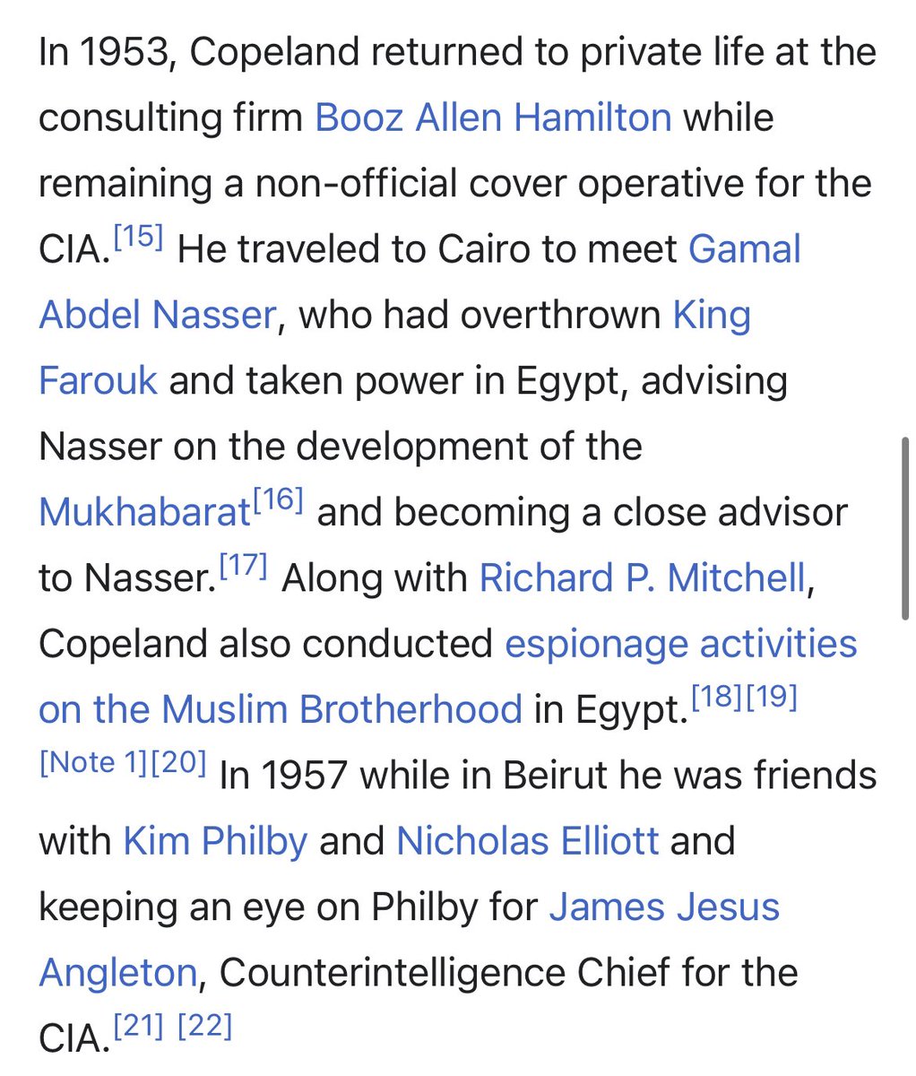 Copeland’s father, Miles Axe Copeland Jr., is known for his participation in the March 1949 Syrian coup and 1953 Iran coup among many other operations. After the 1953 coup Copeland returned to private life working at the consulting firm Booz Hamilton while still operating for the CIA. Wait…. Booz Hamilton? Hmmm who and what else have we connected to Booz Hamilton? I’ll give you ⭐️⭐️⭐️ if you can guess https://en.m.wikipedia.org/wiki/Miles_Copeland_Jr