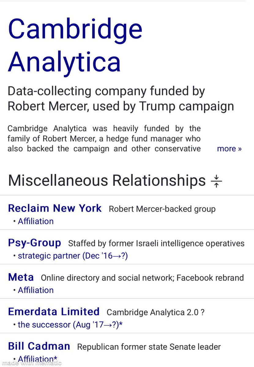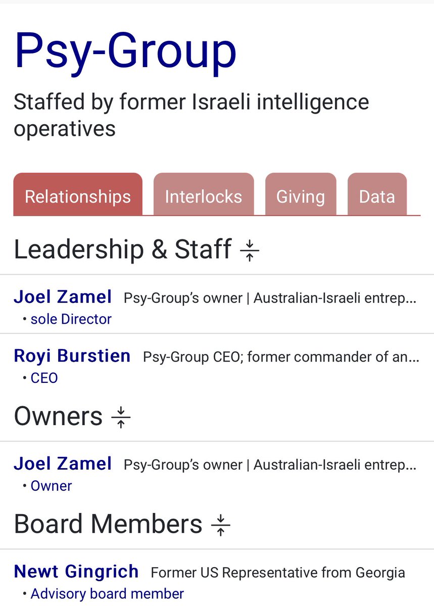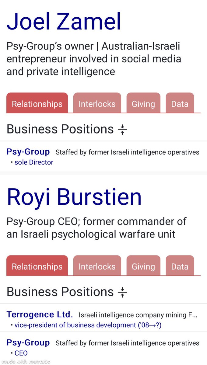 It’s funny you bring up Cambridge Analytica and psyops @Pouissant17 because I just came across this digging into Cambridge and it ties into what @RebelValkyrie17 was discussing in her thread. Cambridge Analytica have been strategic partners with… Psy-Group from December 2016 to its supposed closing in 2018. Who are “Psy-Group”? Psy-Group is a former Israeli private intelligence agency. Former US Speaker Newt Gingrich was a member of the agency’s advisory board, the owner was Joel Zamel an Australian-Israeli entrepreneur involved in social media and private intelligence and Royi Burstien was the CEO, a former commander is the Israeli psychological warfare unit. https://littlesis.org/org/257423-Cambridge_Analytica https://littlesis.org/org/330726-Psy-Group https://littlesis.org/person/330728-Joel_Zamel https://littlesis.org/person/332703-Royi_Burstien