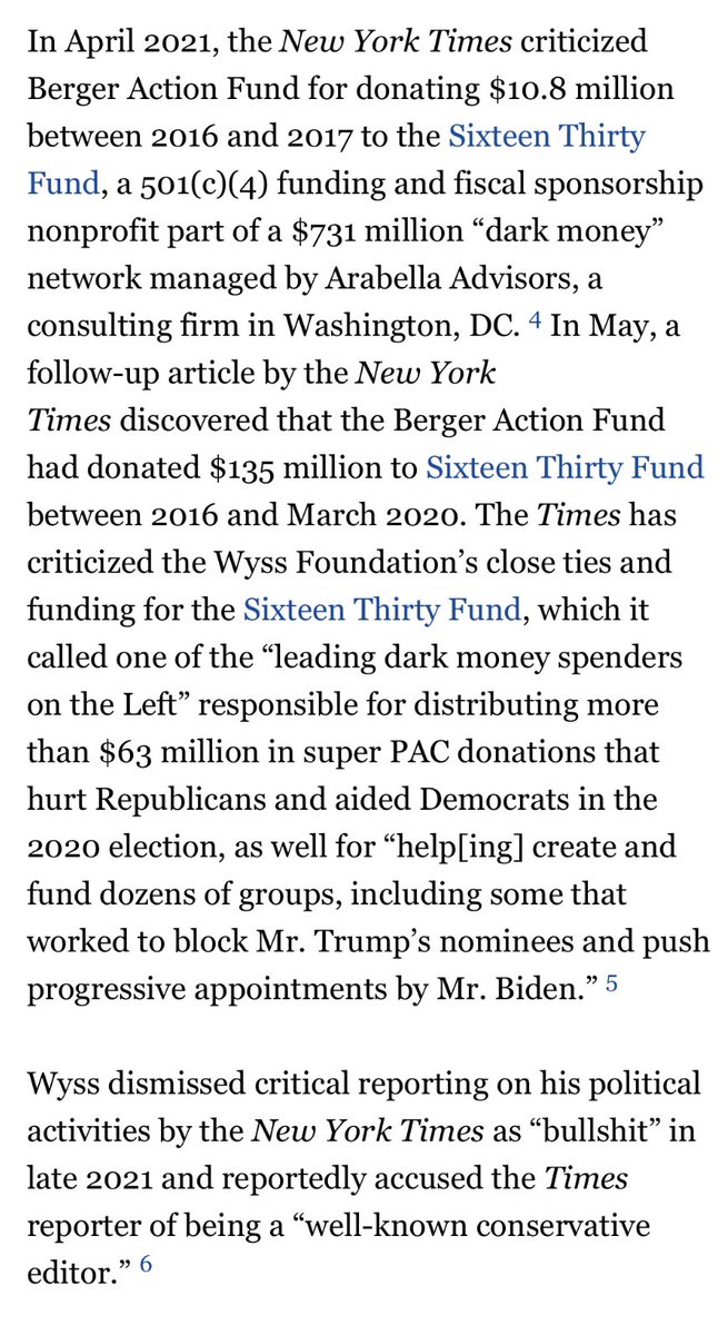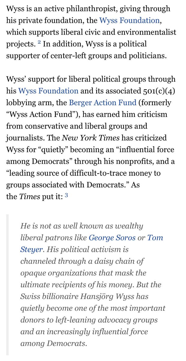 A thread 🧵 into Hansjörg Wyss Who is Hansjörg Wyss and what is he involved with? “Hansjorg Wyss (Hansjörg, sometimes spelled Hansjoerg; pronounced “Veese”) is a Swiss entrepreneur and businessman. He is the former CEO of multinational medical device manufacturer Synthes. Wyss’ net worth is estimated to be over $6.1 billion. Wyss is an active philanthropist, giving through his private foundation, the Wyss Foundation, which supports liberal civic and environmentalist projects. 2 In addition, Wyss is a political supporter of center-left groups and politicians. Wyss’ support for liberal political groups through his Wyss Foundation and its associated 501(c)(4) lobbying arm, the Berger Action Fund (formerly “Wyss Action Fund”), has earned him criticism from conservative and liberal groups and journalists. The New York Times has criticized Wyss for “quietly” becoming an “influential force among Democrats” through his nonprofits, and a “leading source of difficult-to-trace money to groups associated with Democrats.” As the Times put it: “He is not as well known as wealthy liberal patrons like George Soros or Tom Steyer. His political activism is channeled through a daisy chain of opaque organizations that mask the ultimate recipients of his money. But the Swiss billionaire Hansjörg Wyss has quietly become one of the most important donors to left-leaning advocacy groups and an increasingly influential force among Democrats.” In April 2021, the New York Times criticized Berger Action Fund for donating $10.8 million between 2016 and 2017 to the Sixteen Thirty Fund, a 501(c)(4) funding and fiscal sponsorship nonprofit part of a $731 million “dark money” network managed by Arabella Advisors, a consulting firm in Washington, DC. In May, a follow-up article by the New York Times discovered that the Berger Action Fund had donated $135 million to Sixteen Thirty Fund between 2016 and March 2020. The Times has criticized the Wyss Foundation’s close ties and funding for the Sixteen Thirty Fund, which it called one of the “leading dark money spenders on the Left” responsible for distributing more than $63 million in super PAC donations that hurt Republicans and aided Democrats in the 2020 election, as well for “help[ing] create and fund dozens of groups, including some that worked to block Mr. Trump’s nominees and push progressive appointments by Mr. Biden.” Wyss dismissed critical reporting on his political activities by the New York Times as “bullshit” in late 2021 and reportedly accused the Times reporter of being a “well-known conservative editor.””