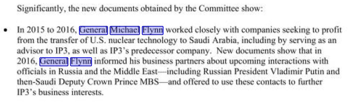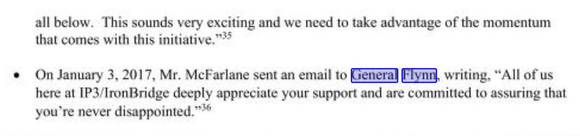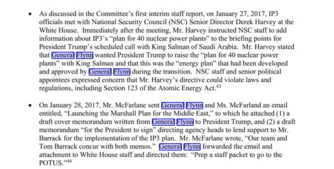 “In 2015 to 2016, General Michael Flynn worked closely with companies seeking to profit from the transfer of U.S. nuclear technology to Saudi Arabia, including by serving as an advisor to IP3, as well as IP3’s predecessor company. New documents show that in 2016, General Flynn informed his business partners about upcoming interactions with officials in Russia and the Middle East—including Russian President Vladimir Putin and then-Saudi Deputy Crown Prince MBS—and offered to use these contacts to further IP3’s business interests.” “IP3 officials traveled to Saudi Arabia in December 2016—after the election and before the inauguration—to solicit a $120 million investment from then-Saudi Deputy Crown Prince MBS in exchange for a 10% stake in IP3. The documents suggest that 1P3 was soliciting these funds by highlighting its close ties to General Flynn and the support of the incoming Trump Administration for lP3’s plan to transfer U.S. nuclear technology to Saudi Arabia. In direct communications with General Flynn, 1P3 officials wrote that “much of our confidence derives from how emphatically positive your message expressing your—and the President Elect’s—support for the Marshall Plan, was received by the leadership of KSA [Kingdom of Saudi Arabia].””