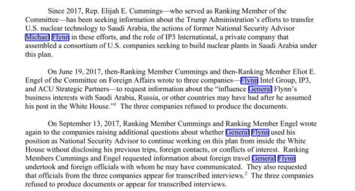 “Since 2017, Rep. Elijah E. Cummings—who served as Ranking Member of the Committee—has been seeking information about the Trump Administration’s efforts to transfer U.S. nuclear technology to Saudi Arabia, the actions of former National Security Advisor Michael Flynn in these efforts, and the role of IP3 International, a private company that assembled a consortium of U.S. companies seeking to build nuclear plants in Saudi Arabia under this plan. On June 19, 2017, then-Ranking Member Cummings and then-Ranking Member Eliot E. Engel of the Committee on Foreign Affairs wrote to three companies—Flynn Intel Group, IP3, and ACU Strategic Partners—to request information about the “influence General Flynn’s business interests with Saudi Arabia, Russia, or other countries may have had after he assumed his post in the White House.” 1 The three companies refused to produce the documents. On September 13, 2017, Ranking Member Cummings and Ranking Member Engel wrote again to the companies raising additional questions about whether General Flynn used his position as National Security Advisor to continue working on this plan from inside the White House without disclosing his previous trips, foreign contacts, or conflicts of interest. Ranking Members Cummings and Engel requested information about foreign travel General Flynn undertook and foreign officials with whom he may have communicated. They also requested that officials from the three companies appear for transcribed interviews. 2 The three companies refused to produce documents or appear for transcribed interviews. On December 6, 2017, Ranking Member Cummings wrote to Rep. Trey Gowdy, who then served as Chainnan of the Committee, with infonnation from a whistleblower relating to a former business partner of General Flynn boasting on Inauguration Day that the plan to transfer”