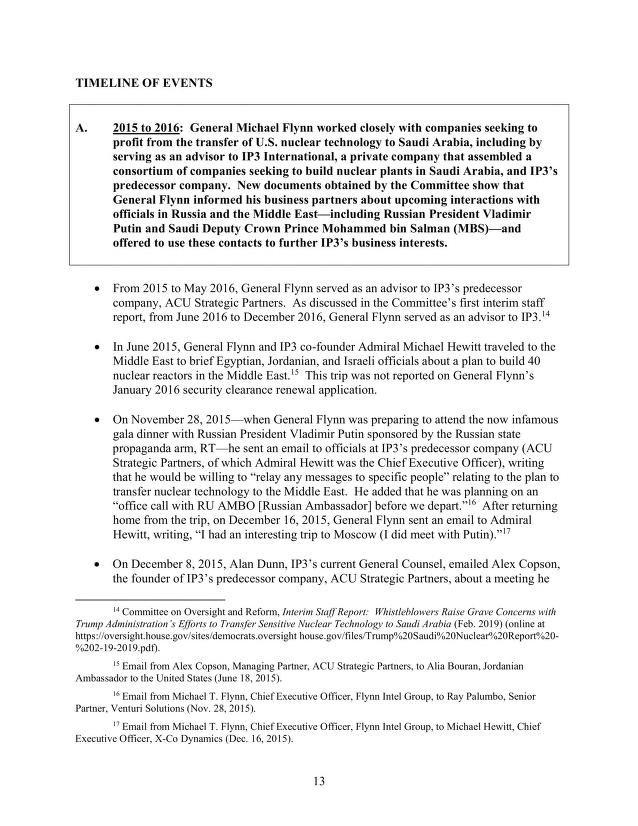 Timeline of Events: “2015 to 2016 : General Michael Flynn worked closely with companies seeking to profit from the transfer of U.S. nuclear technology to Saudi Arabia, including by serving as an advisor to IP3 International, a private company that assembled a consortium of companies seeking to build nuclear plants in Saudi Arabia, and IP3’s predecessor company. New documents obtained by the Committee show that General Flynn informed his business partners about upcoming interactions with officials in Russia and the Middle East—including Russian President Vladimir Putin and Saudi Deputy Crown Prince Mohammed bin Salman (MBS)—and offered to use these contacts to further IP3’s business interests. From 2015 to May 2016, General Flynn served as an advisor to IP3’s predecessor company, ACU Strategic Partners. As discussed in the Committee’s first interim staff report, from June 2016 to December 2016, General Flynn served as an advisor to IP3. In June 2015, General Flynn and IP3 co-founder Admiral Michael Hewitt traveled to the Middle East to brief Egyptian, Jordanian, and Israeli officials about a plan to build 40 nuclear reactors in the Middle East. This trip was not reported on General Flynn’s January 2016 security clearance renewal application. On November 28, 2015—when General Flynn was preparing to attend the now infamous gala dinner with Russian President Vladimir Putin sponsored by the Russian state propaganda ann, RT—he sent an email to officials at IP3’s predecessor company (ACU Strategic Partners, of which Admiral Hewitt was the Chief Executive Officer), writing that he would be willing to “relay any messages to specific people” relating to the plan to transfer nuclear technology to the Middle East. He added that he was planning on an “office call with RU AMBO [Russian Ambassador] before we depart.” 16 After returning home from the trip, on December 16, 2015, General Flynn sent an email to Admiral Hewitt, writing, “I had an interesting trip to Moscow (I did meet with Putin).” • On December 8, 2015, Alan Dunn, IP3’s current General Counsel, emailed Alex Copson, the founder of IP3’s predecessor company, ACU Strategic Partners, about a meeting he had with the Saudi Ambassador to the United States, Prince Abdullah bin Faisal bin Turki bin Abdullah al Saud. Mr. Dunn wrote, “When we described how the architecture of the project is intended to align Saudi, US and Russian interests on many important issues for the 80 year life of the project, Amb. Abdullah showed keen interest.” Mr. Copson forwarded the email to other ACU officials and advisors, including General Flynn.”